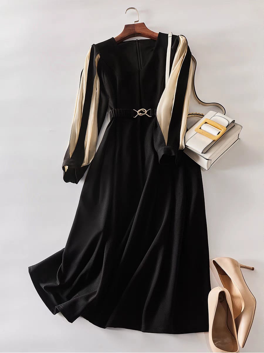 エレガントなカッティングと、立体感のある異素材切り替えスリーブが印象的なAラインワンピース。