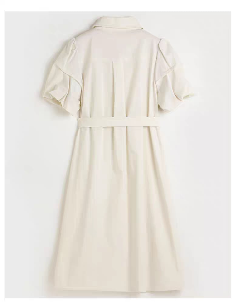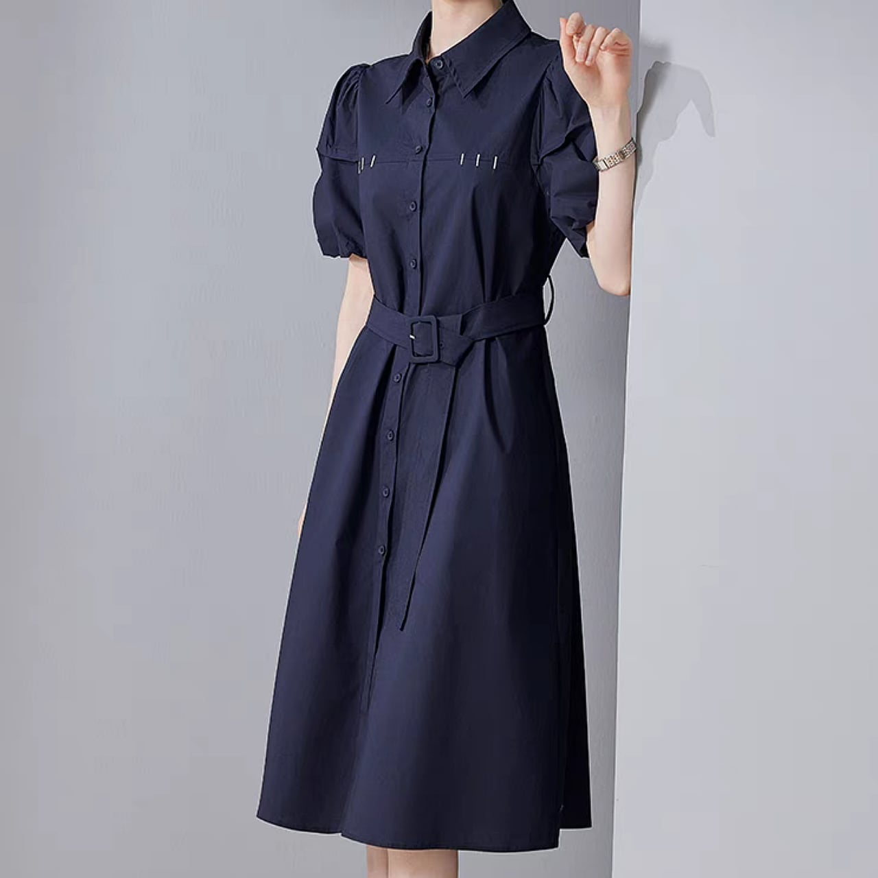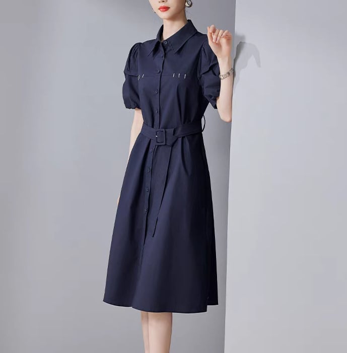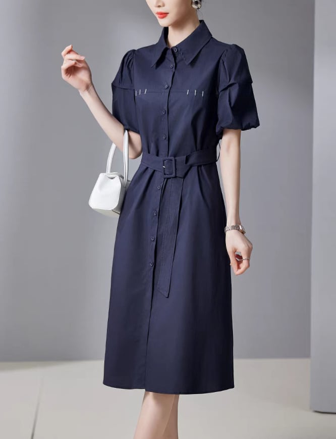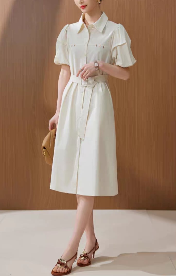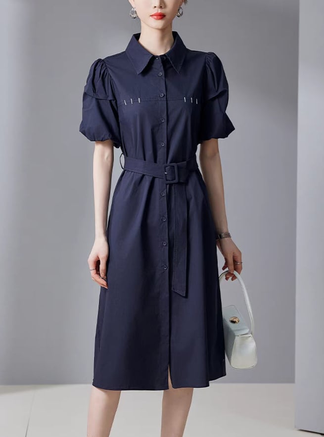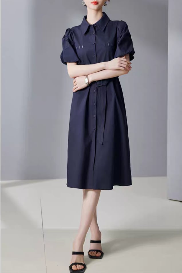 クラシックなシャツ襟デザインに、フェミニンなパフスリーブを組み合わせた上品な印象のワンピースです。