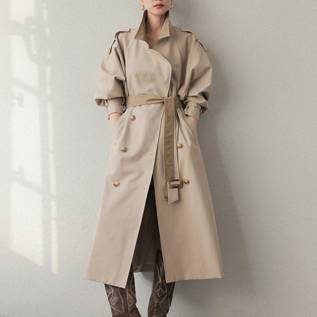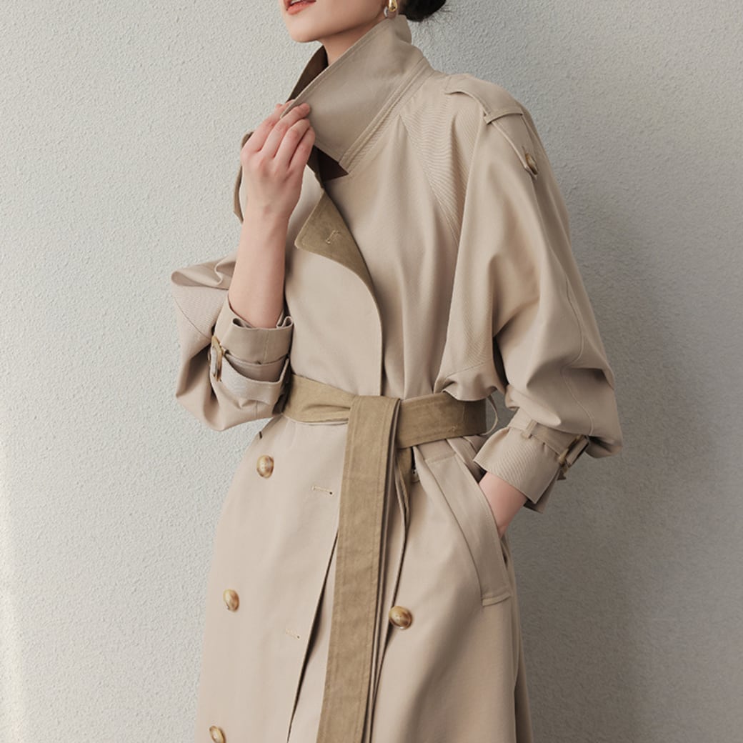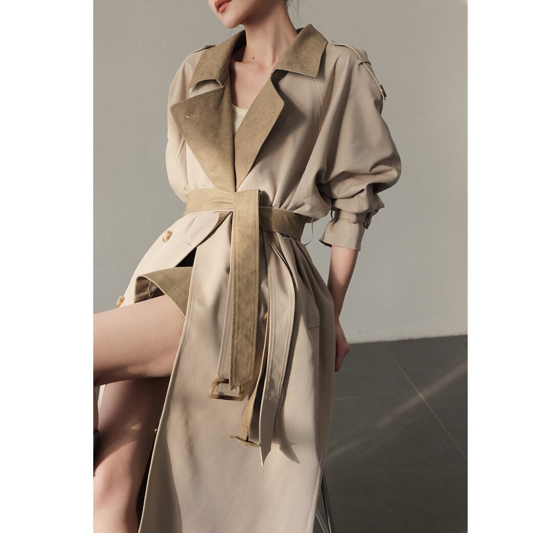 立体感のあるボリュームスリーブやダブルブレストのフロント、共布のウエストベルトが、スタイリッシュなシルエットを演出。