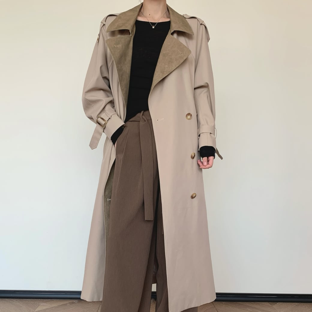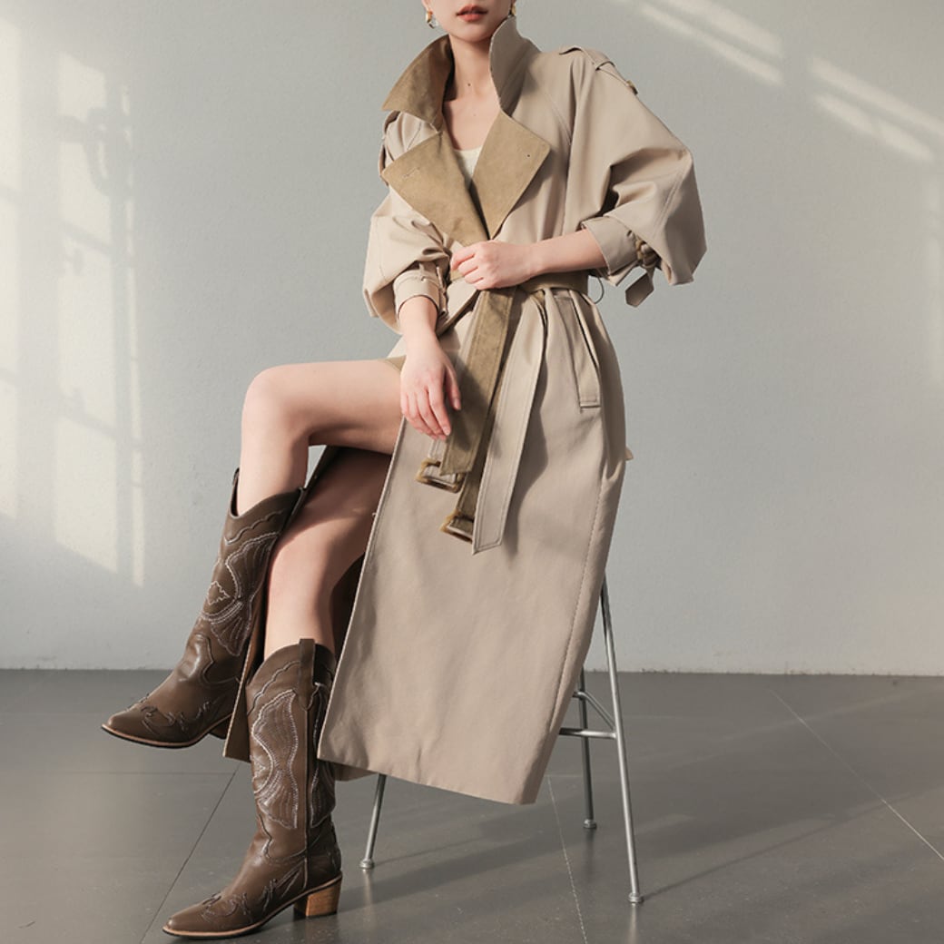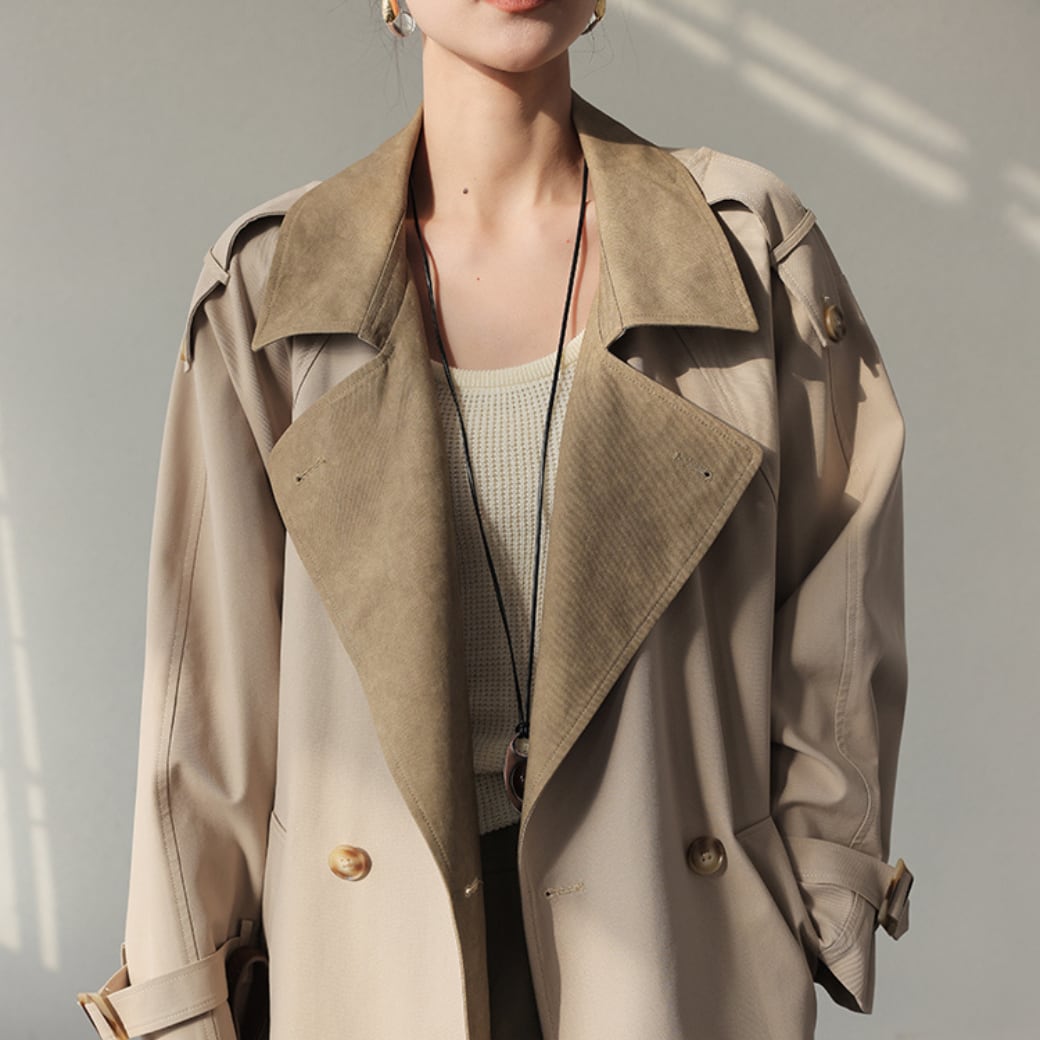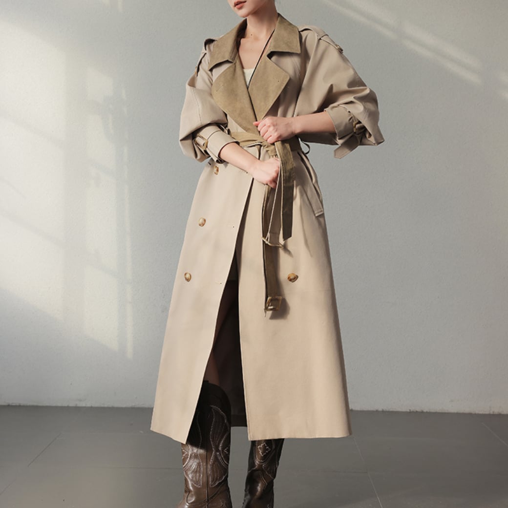 立体感のあるボリュームスリーブやダブルブレストのフロント、共布のウエストベルトが、スタイリッシュなシルエットを演出。