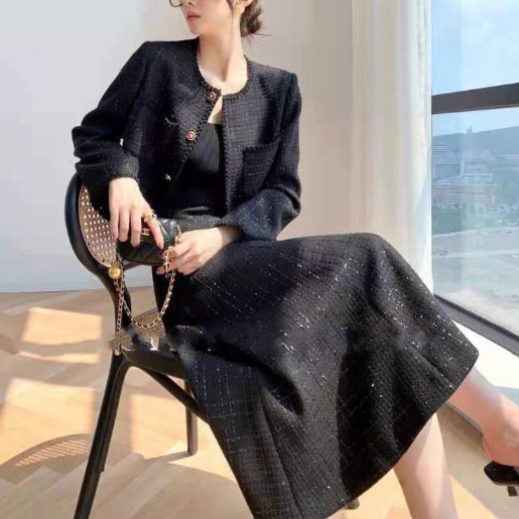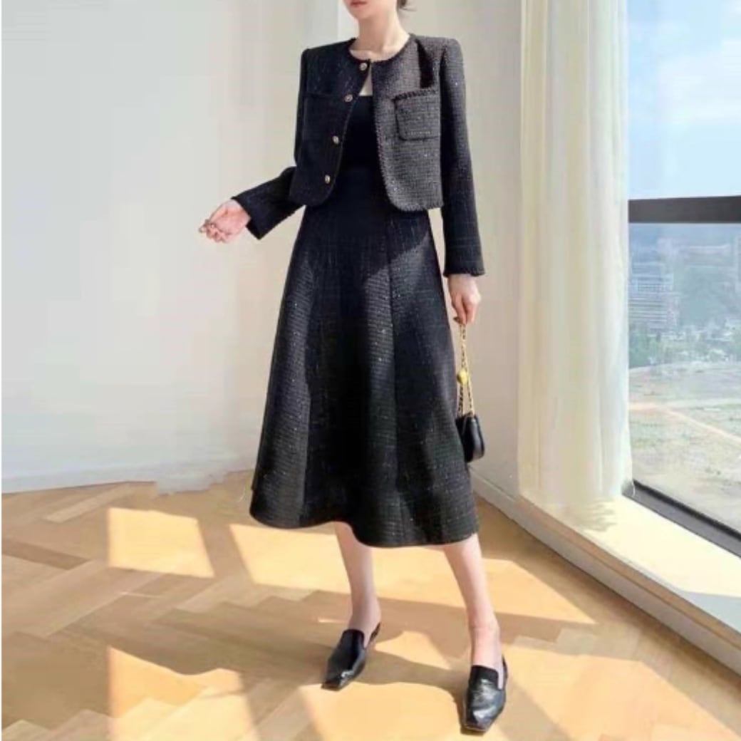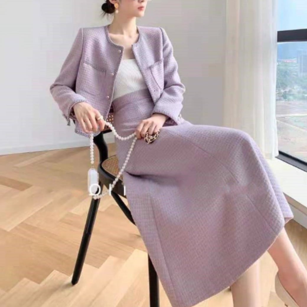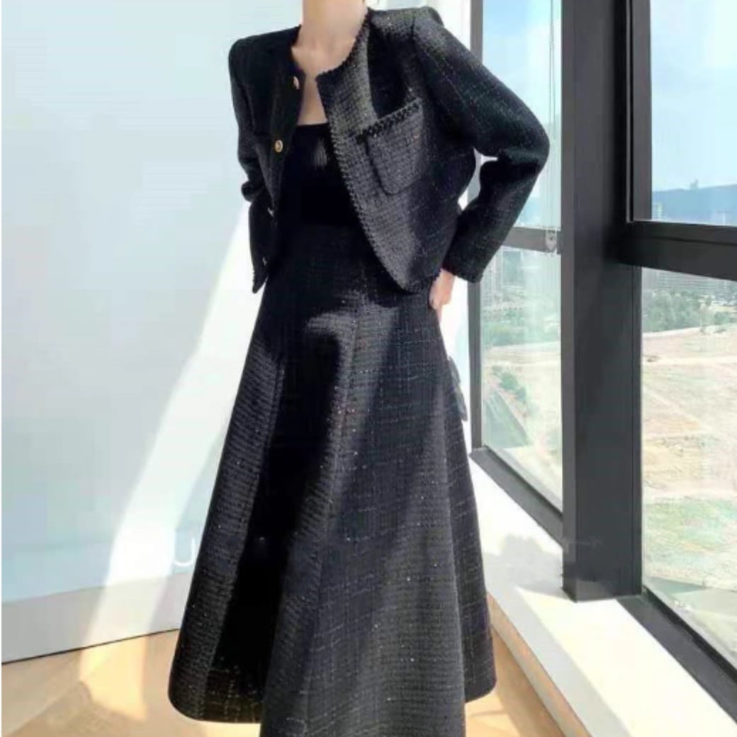 コンパクトな開襟ジャケットと、ふんわりと広がるフレアスカートが美しいシルエットを演出します。