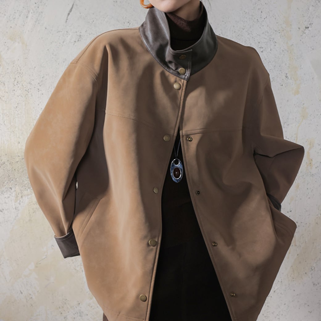 モードな印象を与える、リバーシブル仕様のフェイクレザージャケット。