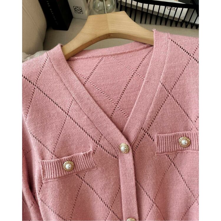 ダイヤ柄の編地が印象的なニットワンピース。深めのVネックとフロントのボタンディテールが縦のラインを強調し、すっきりとした印象に。