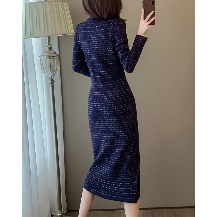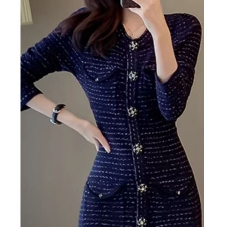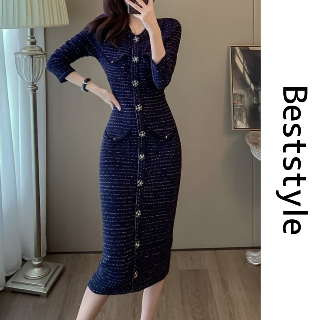 Blue Knit Dress Tweed Style Button Slim Fit 30031