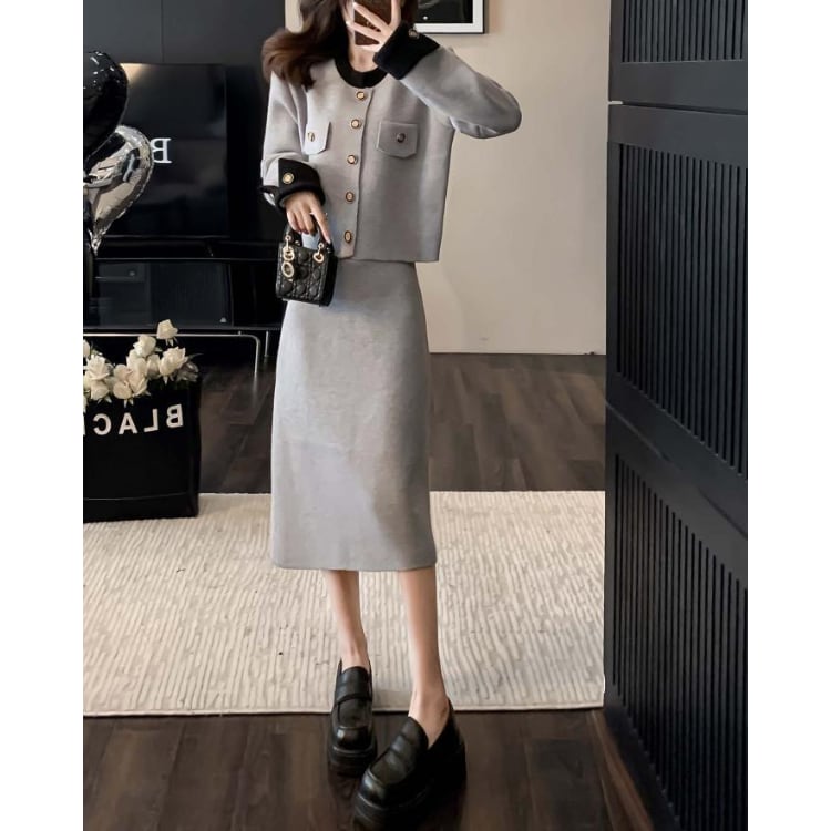 Knit Jacket Skirt Set Contrast Trim 2Colors 30045