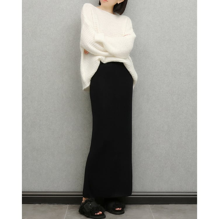 身体のラインに沿ってきれいにフィットするニット素材のロングスカート。