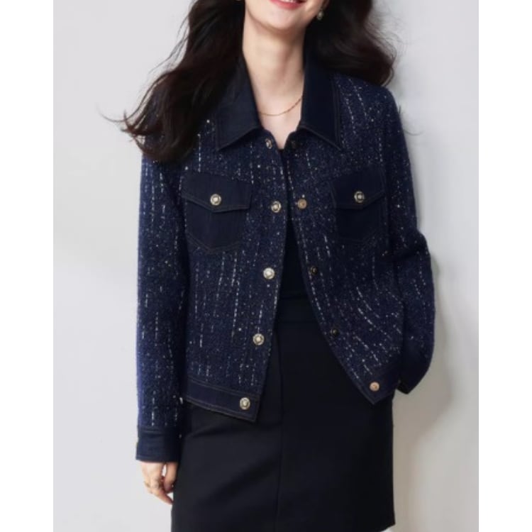 Tweed Denim Patchwork Jacket Contrast Pocket 30055