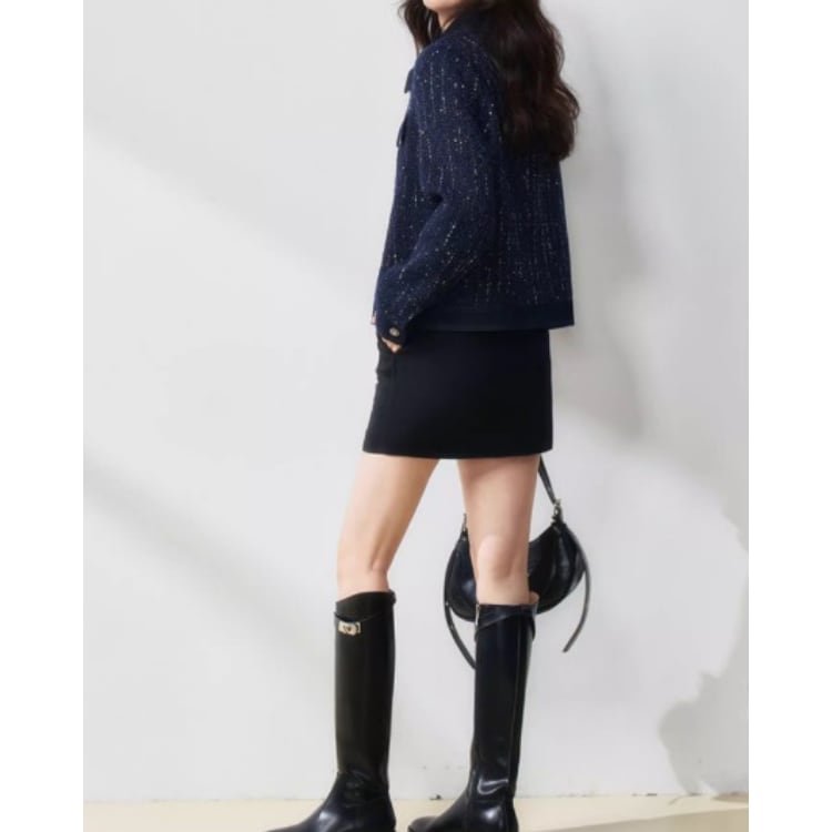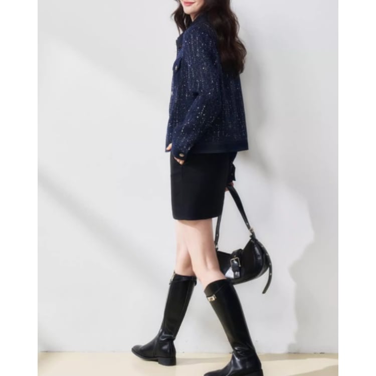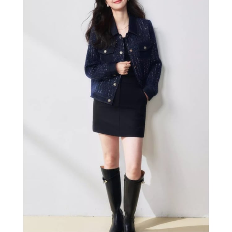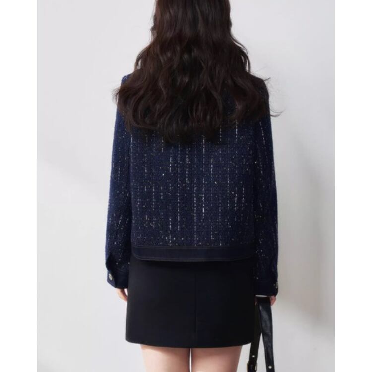 ツイード調の華やかさとデニム風のカジュアルさが融合した、異素材ミックスのショートジャケット。