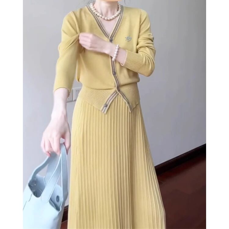 Knit Pleats Cardigan Skirt Set Long Silhouette 30059