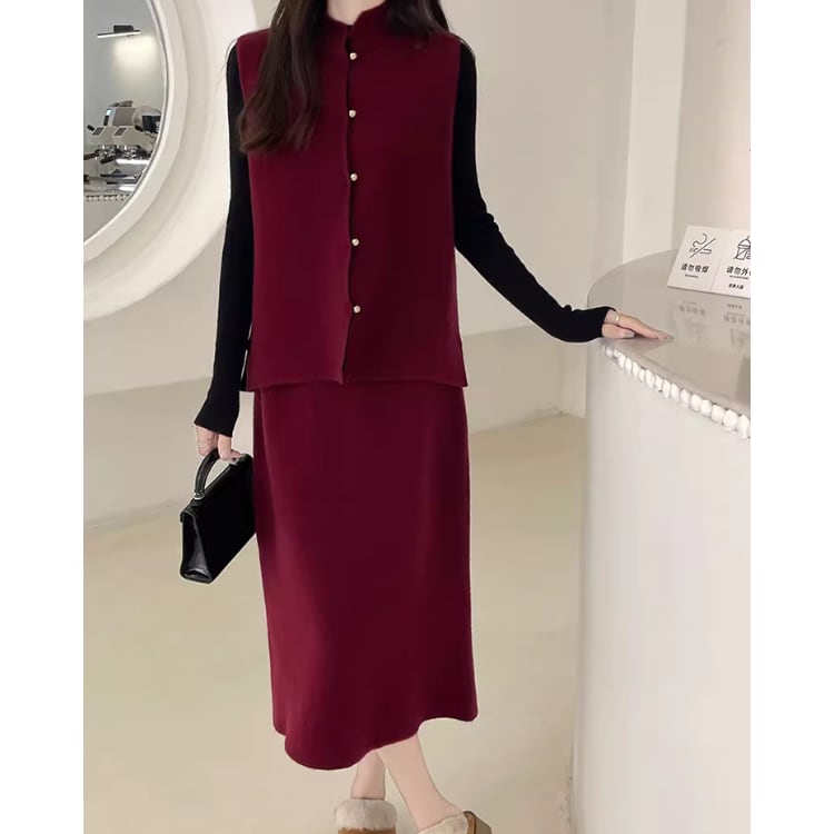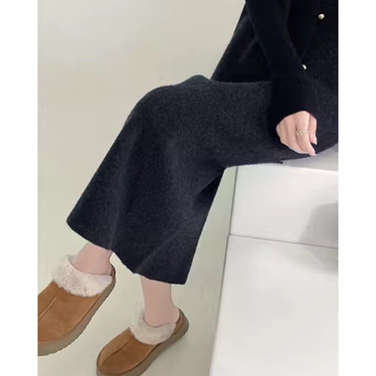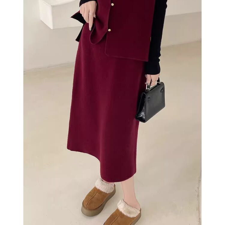 Wool Knit Set Stand Collar Open Front Midi Skirt 2Colors 30071