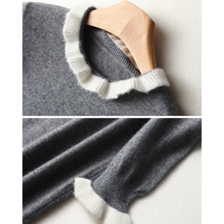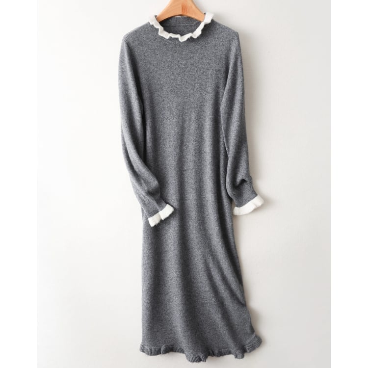 ウール100%の柔らかなニット素材で仕立てた長袖ワンピース。首元・袖口・裾に施された配色のメローフリルが、シンプルなシルエットにさりげない表情を加えています。
