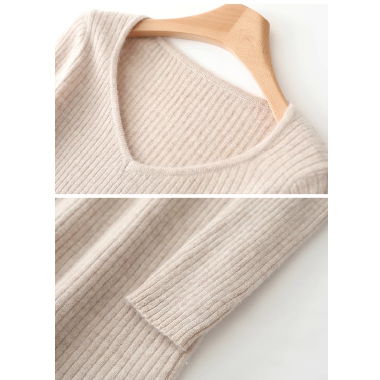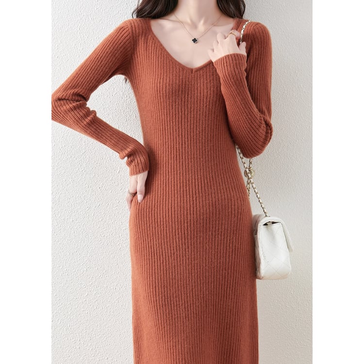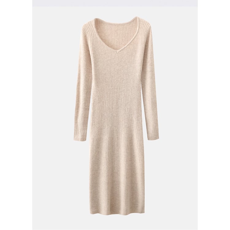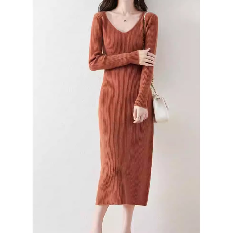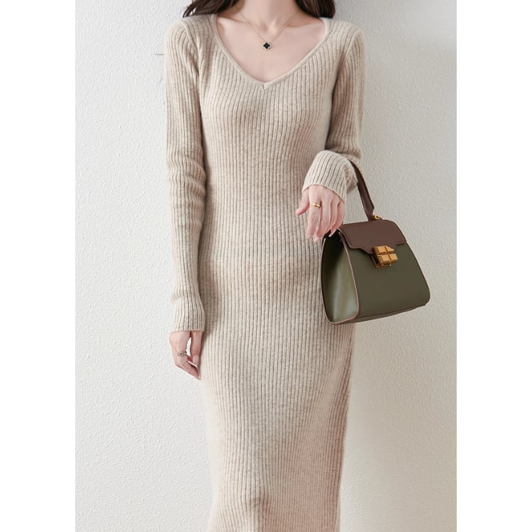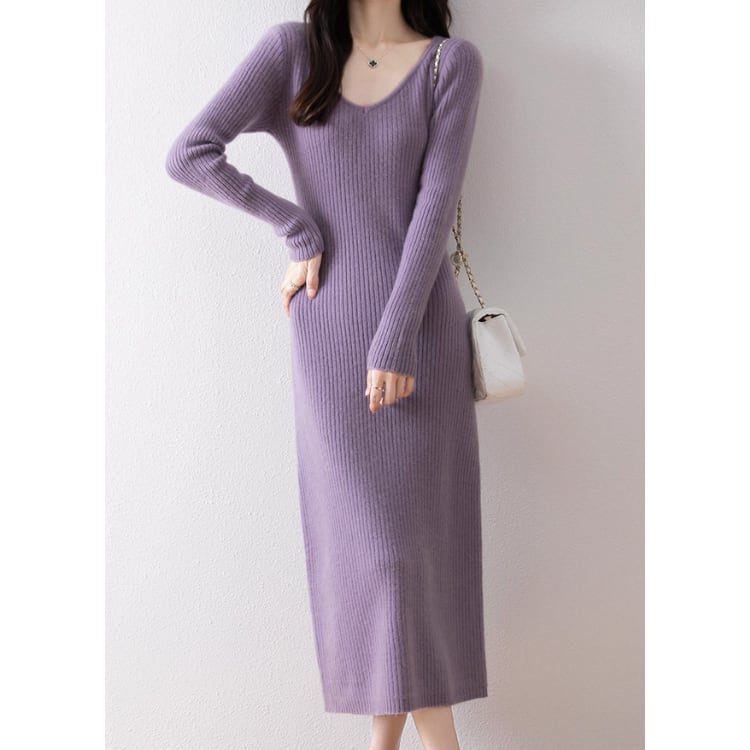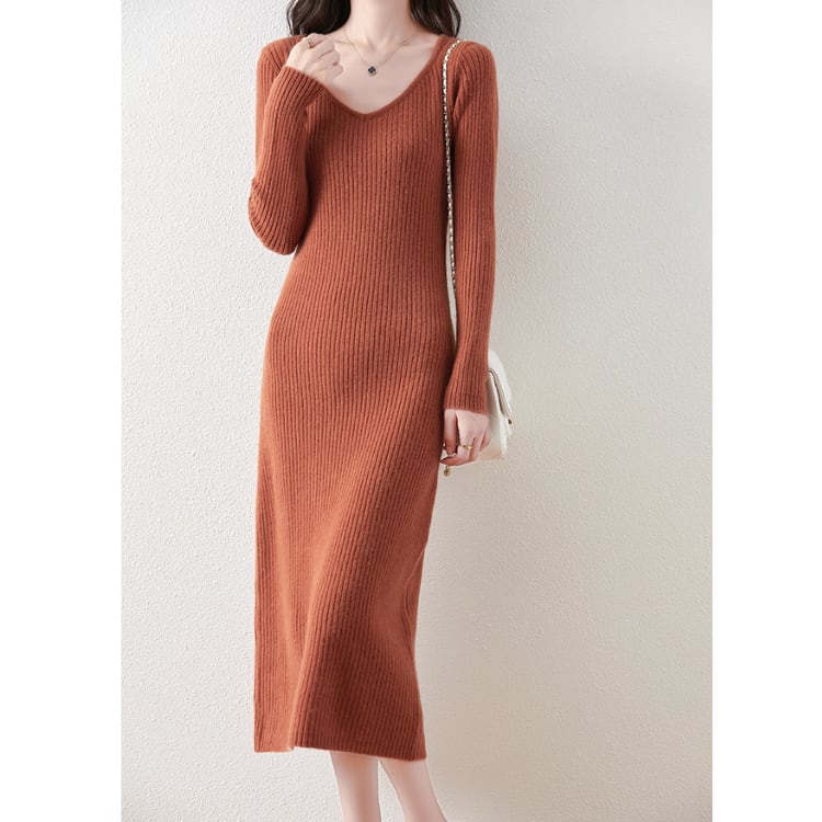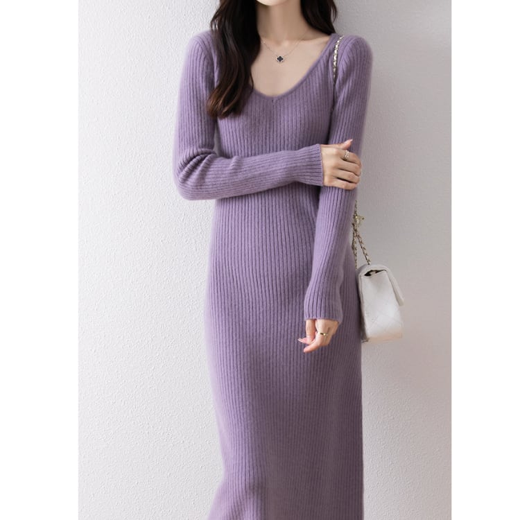 Wool Knit Dress V-Neck Ribbed Slim Fit Long Sleeve 4Colors 30077