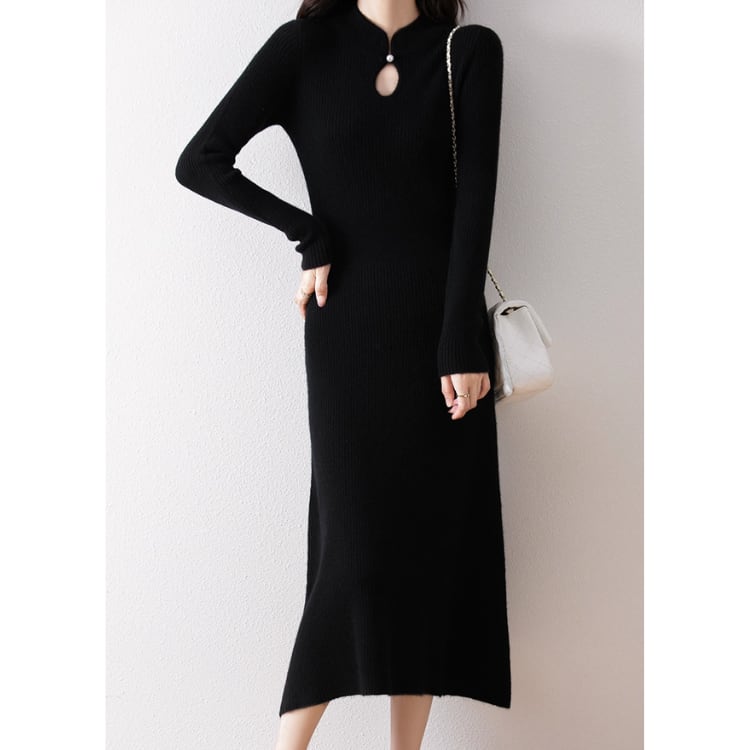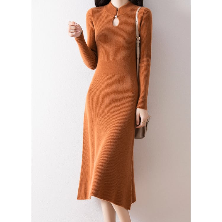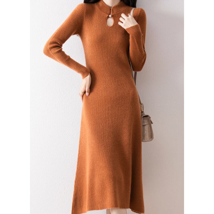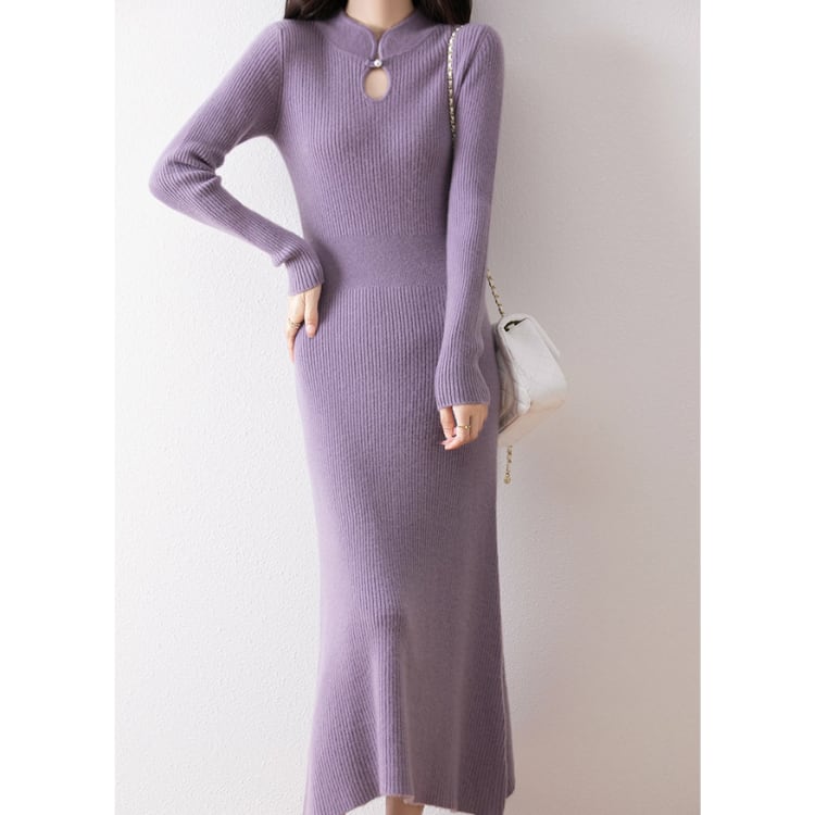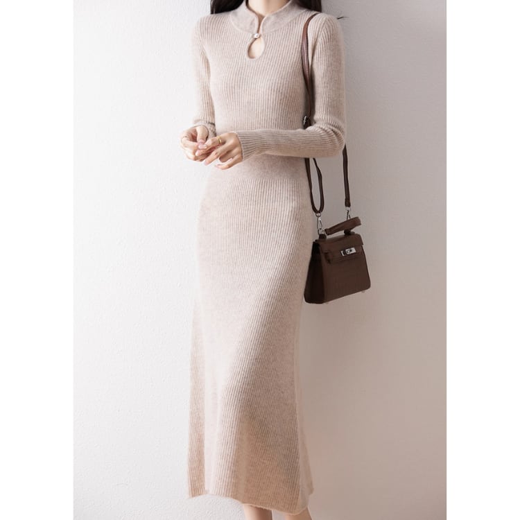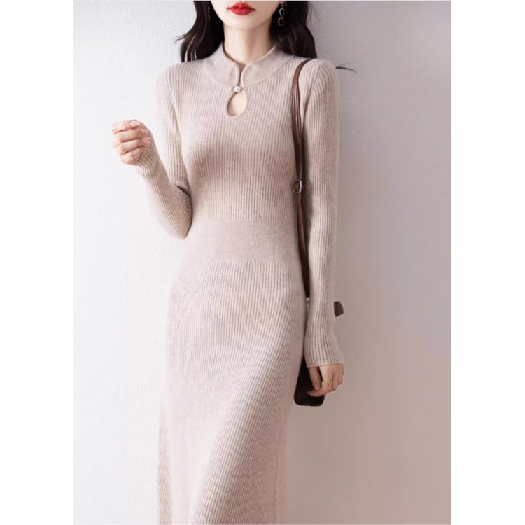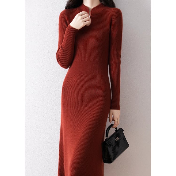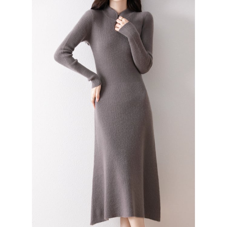 Wool Knit Stand Collar Dress Long Sleeve Midi 6Colors 30082