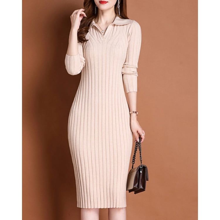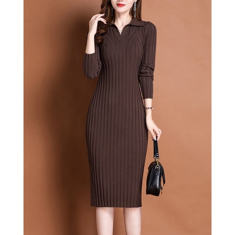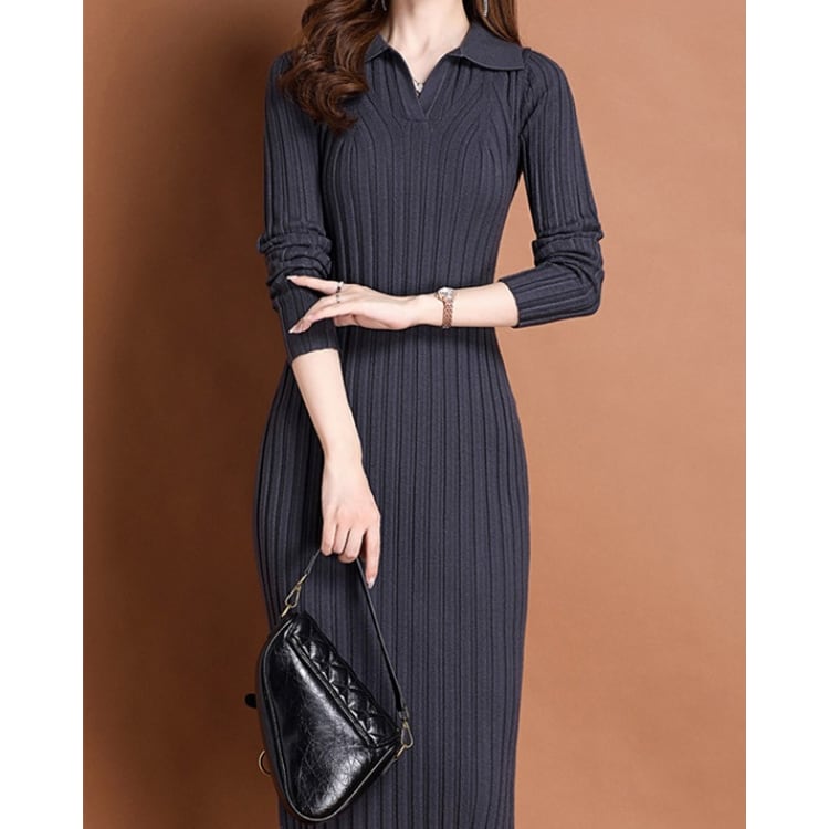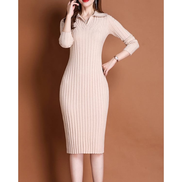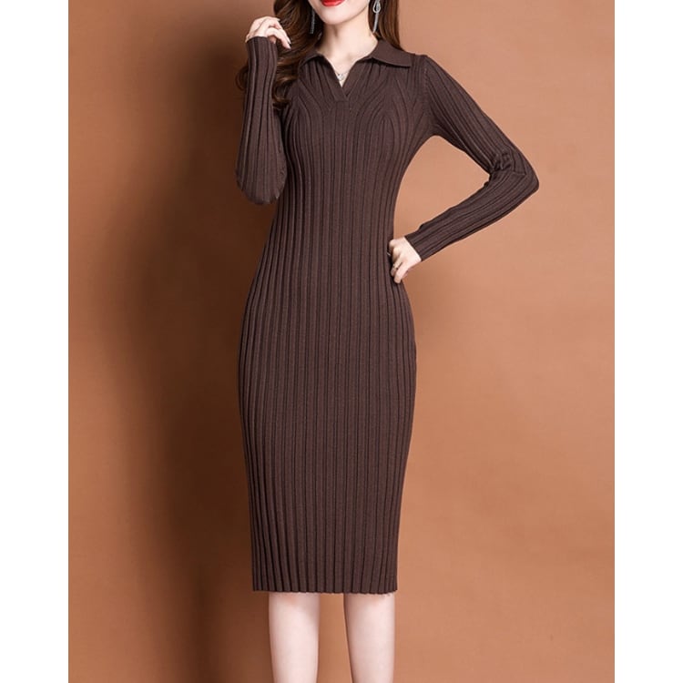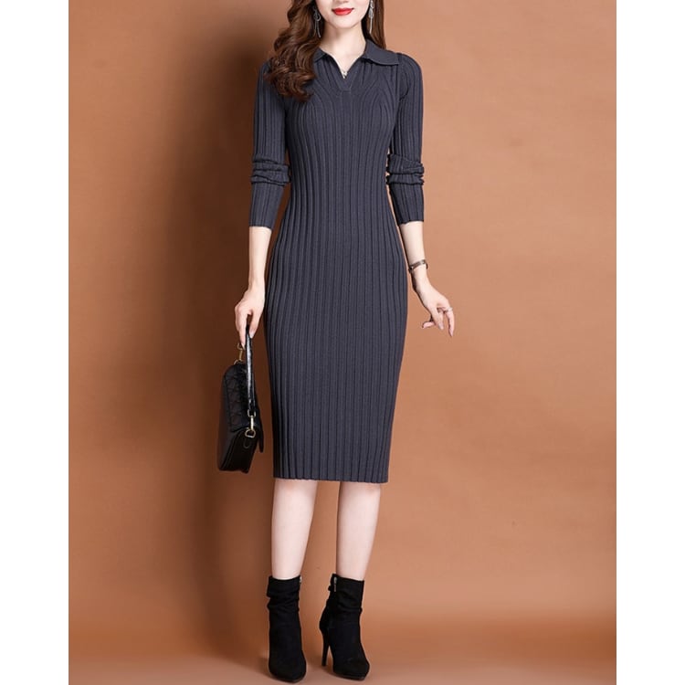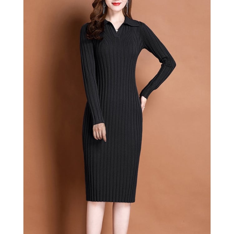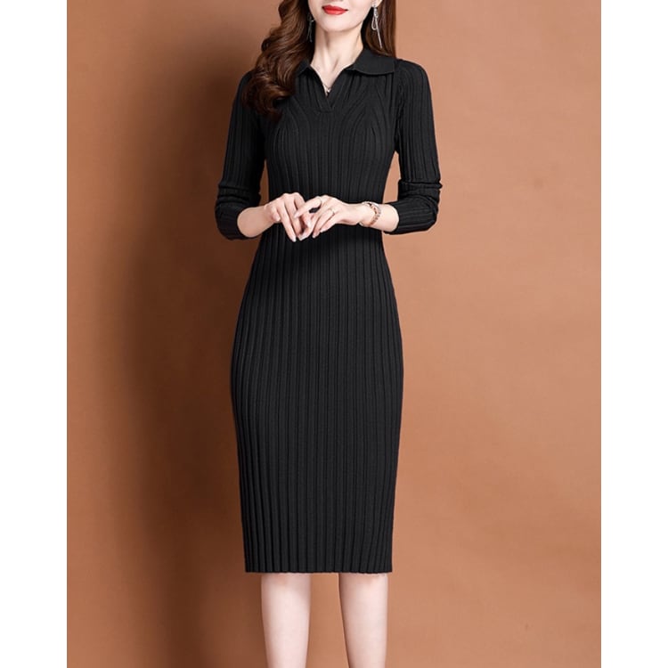 Rib Knit Polo Collar Bodycon Dress Long Sleeve 4Colors 30087