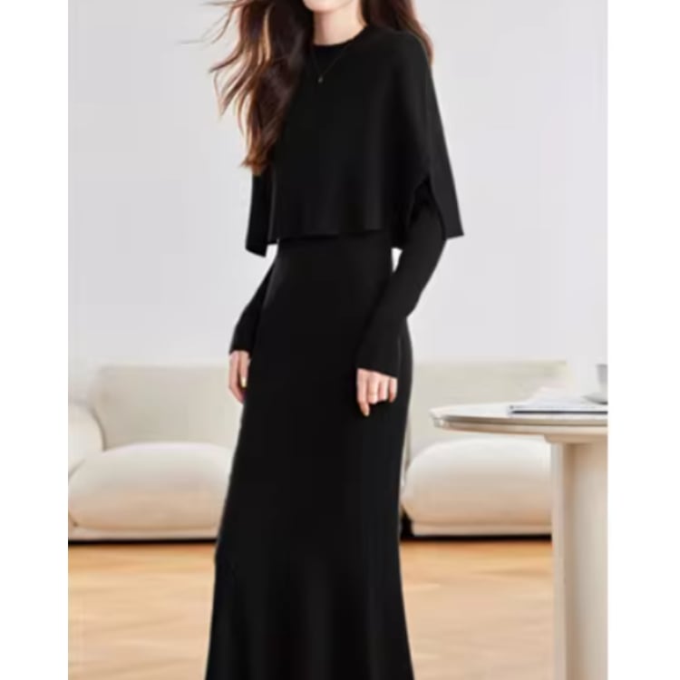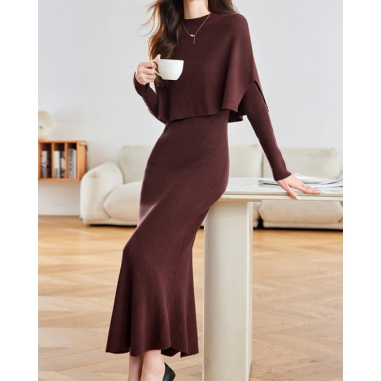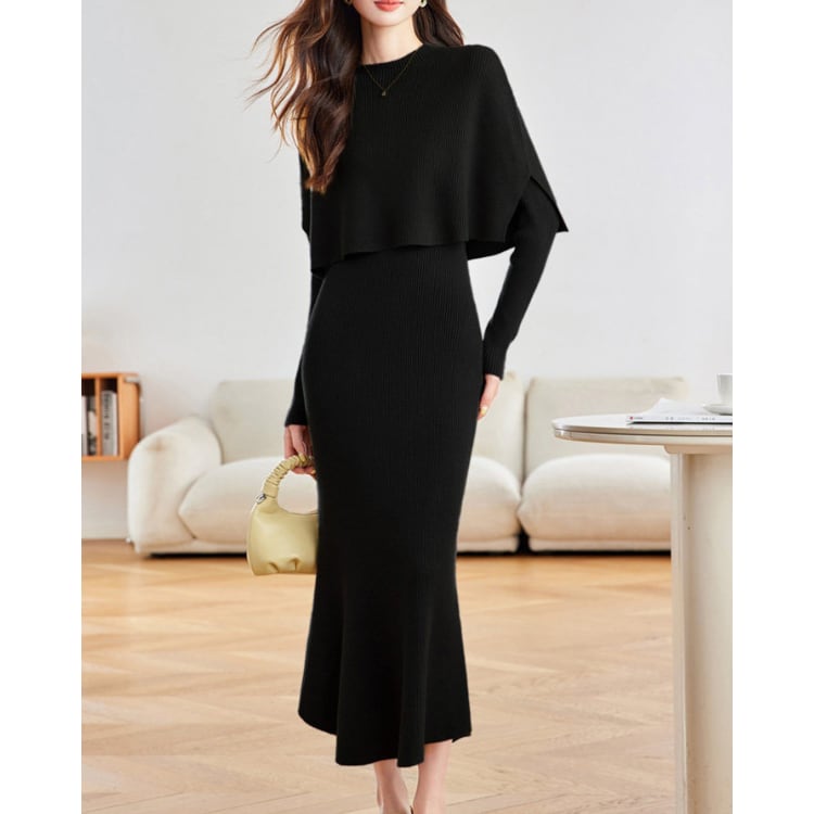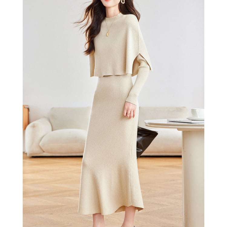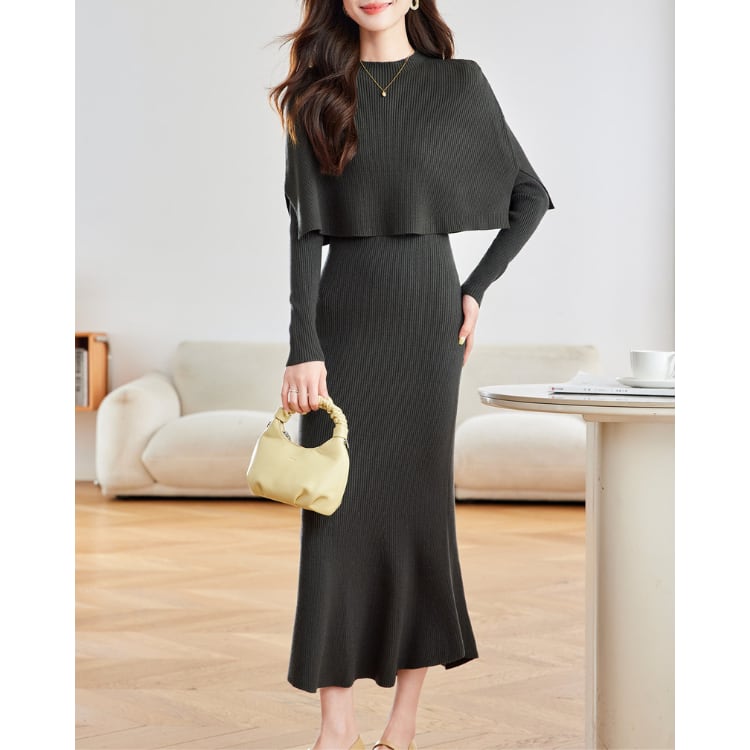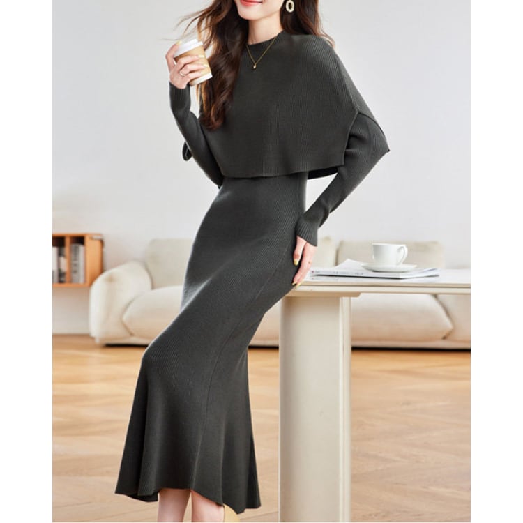 リブ編みニットワンピースにケープデザインを組み合わせたニットセット。トップ部分は肩から自然に落ちるケープ構造になっており、上半身に柔らかなレイヤー感を作りながらシルエットに立体感を加えています。