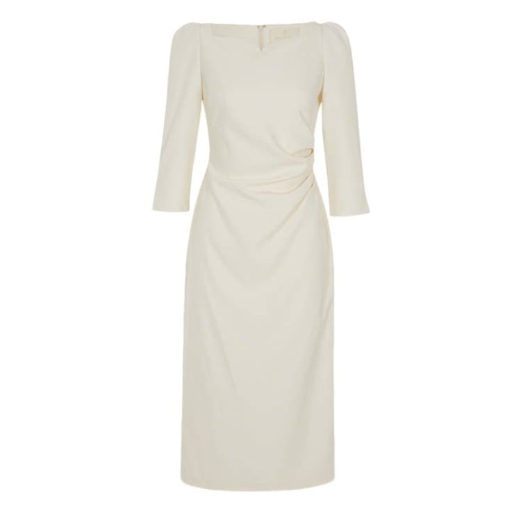 スクエアネックラインがデコルテを横に広く見せ、首元から肩にかけてのラインを整えるワンピース。直線的なネックカットにより上半身のバランスがすっきり見える構造です。