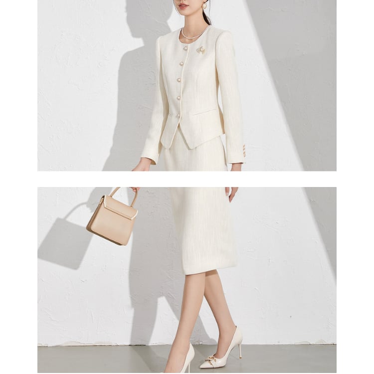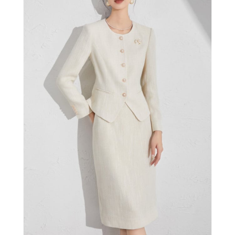 ノーカラーのショートジャケットとミディ丈スカートを組み合わせたセットアップ。すっきりとしたラウンドネックラインが首元を整え、フロントボタンの縦ラインが全体のバランスを引き締める構造になっています。