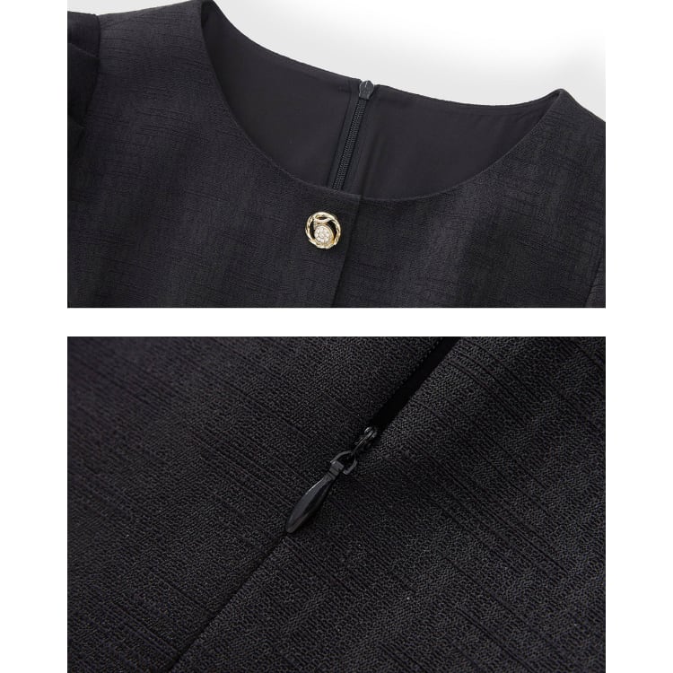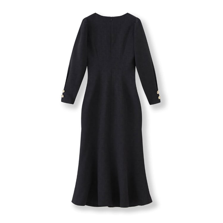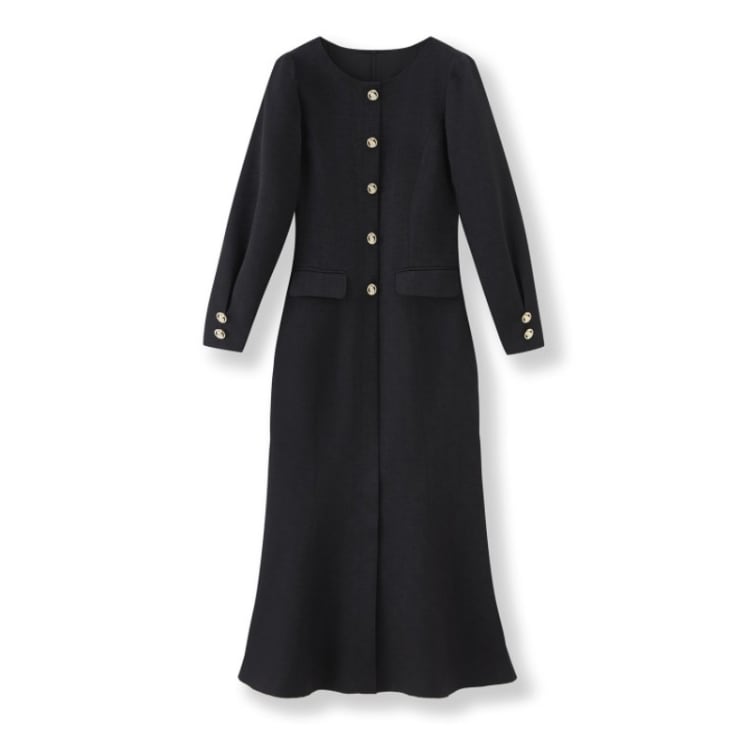 フロントボタンデザインを取り入れたロング丈ワンピース。シンプルなラウンドネックと縦に並ぶボタンが、全体のラインを縦方向に整える構造になっています。