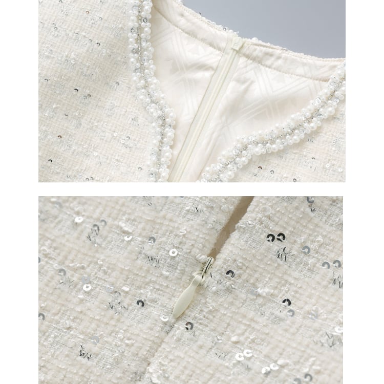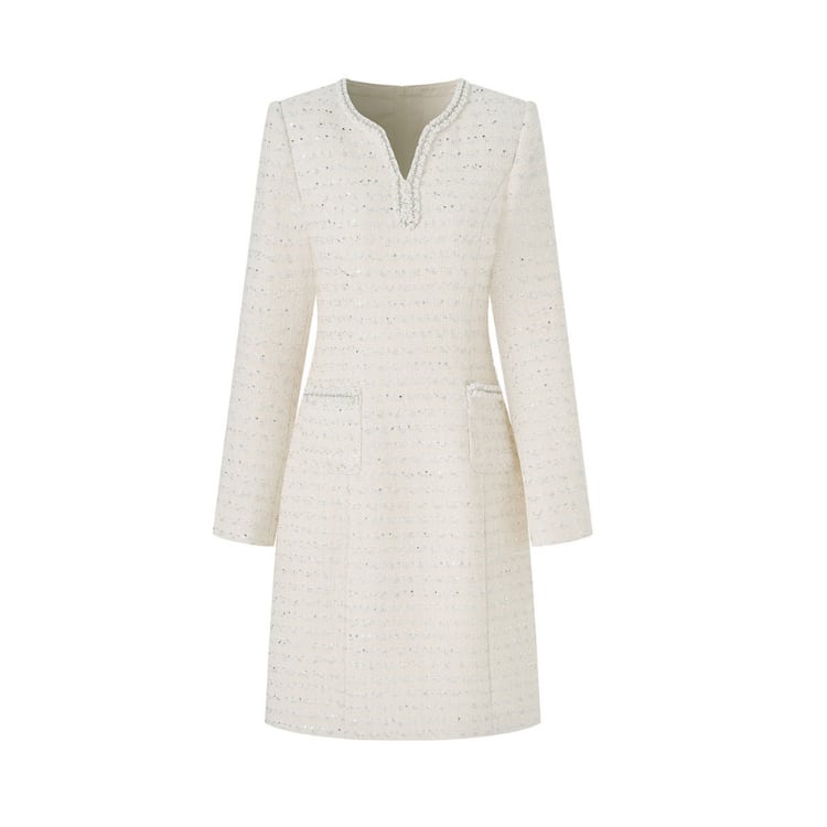 ツイード調素材にパール装飾を組み合わせた長袖ワンピース。生地表面に織り込まれた装飾糸とパールディテールが、全体のテクスチャーに立体感を加えるデザインです。