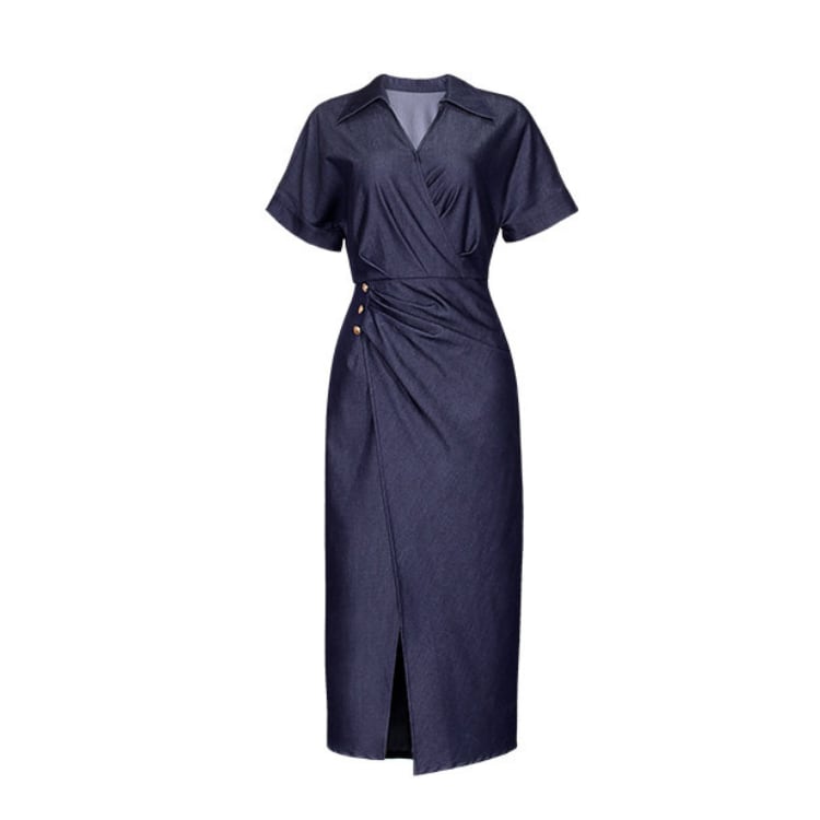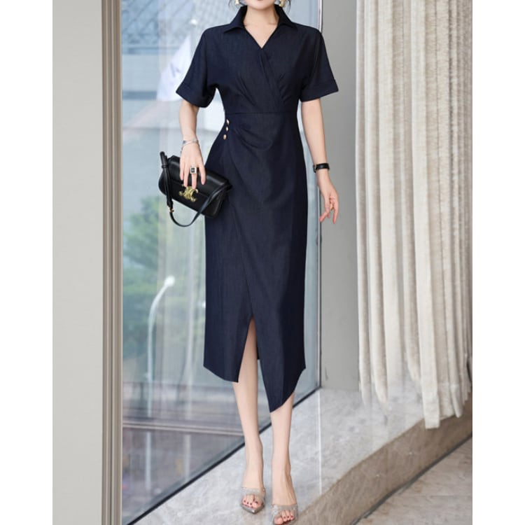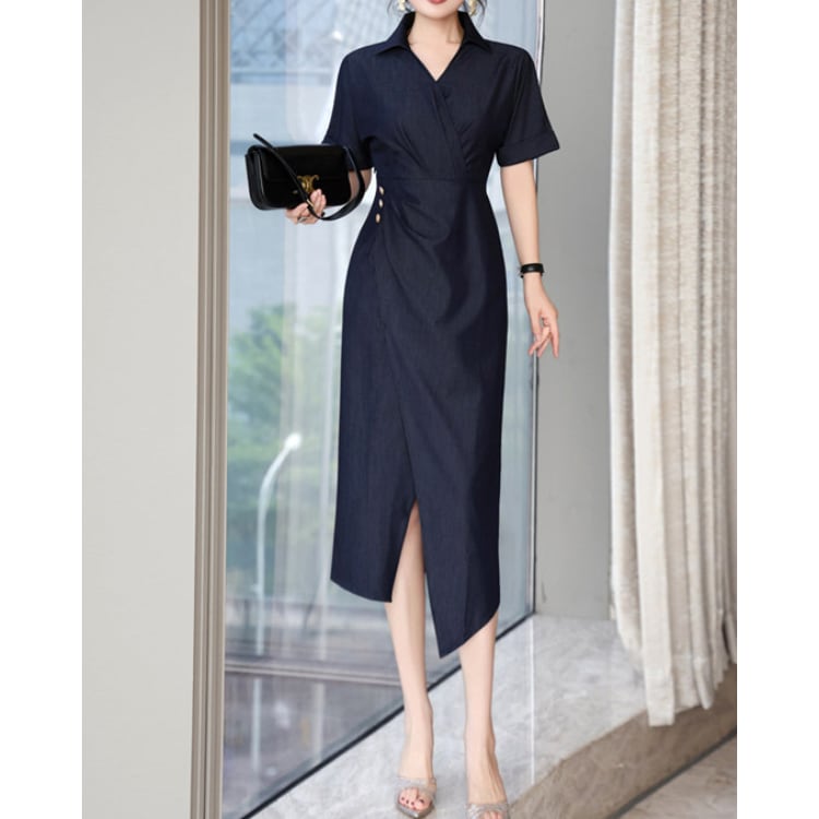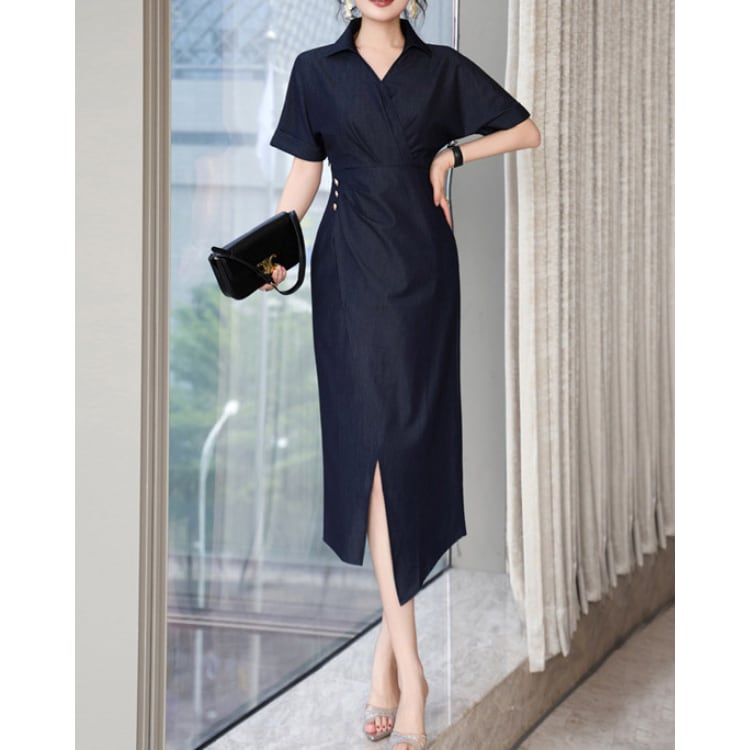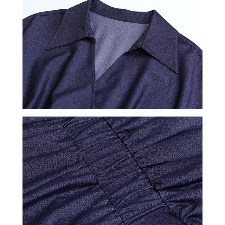 Silk Blend Polo Collar Denim Midi Dress Women 30111