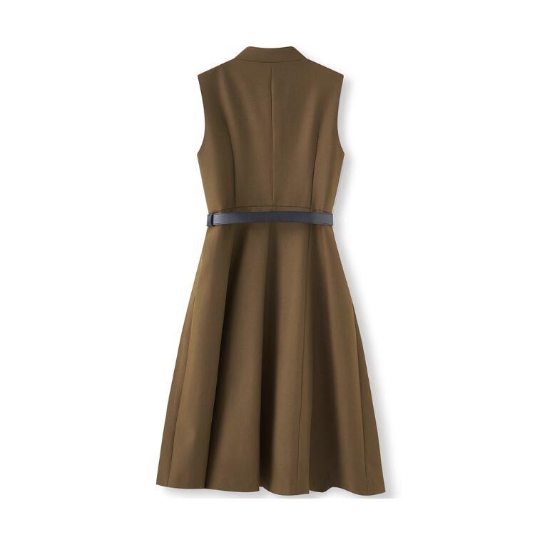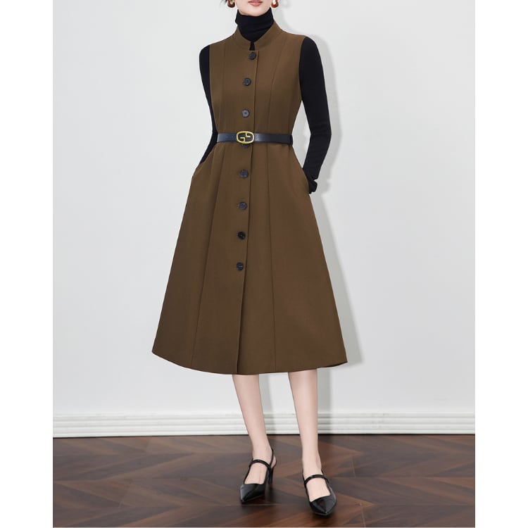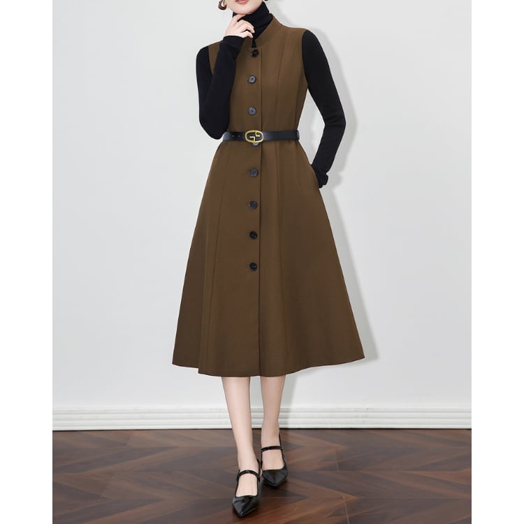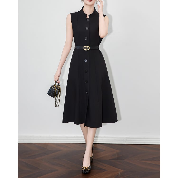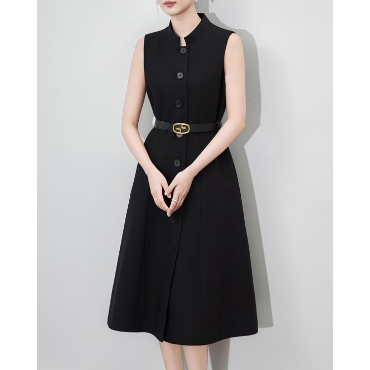 Sleeveless A Line Midi Dress Belted Front Button 2Colors 30115