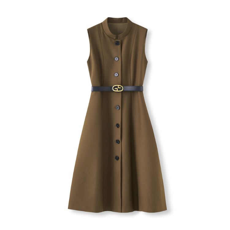 フロントボタン仕様のノースリーブワンピース。縦方向のパネル切替を入れた構造で、ウエストから裾に向かって広がるAラインシルエットを形成しています。