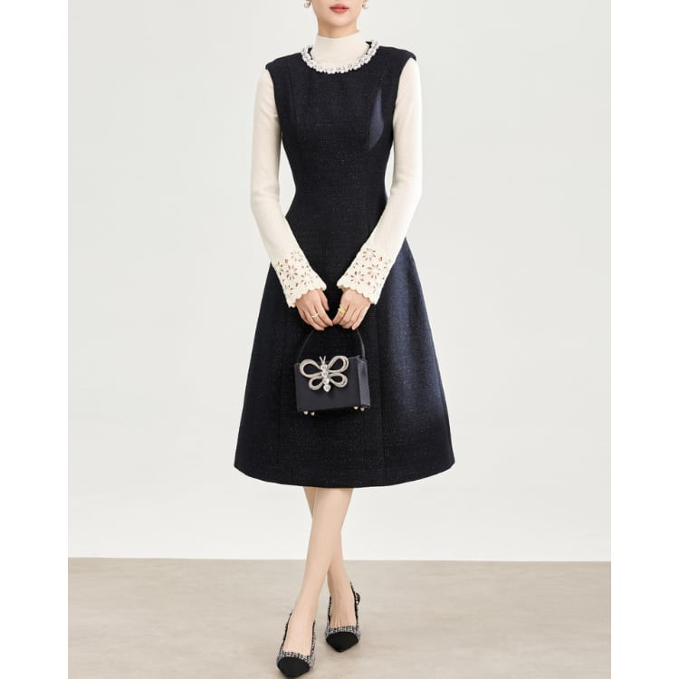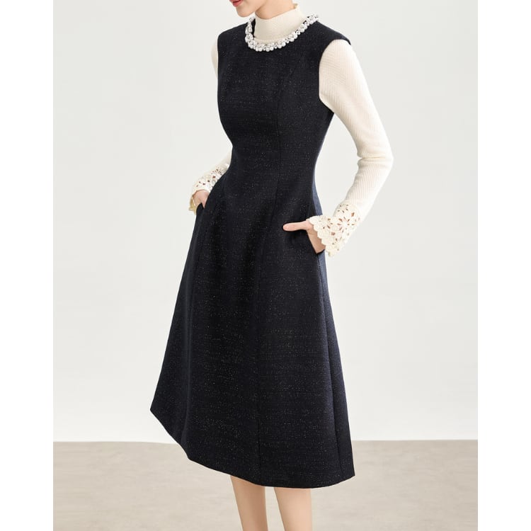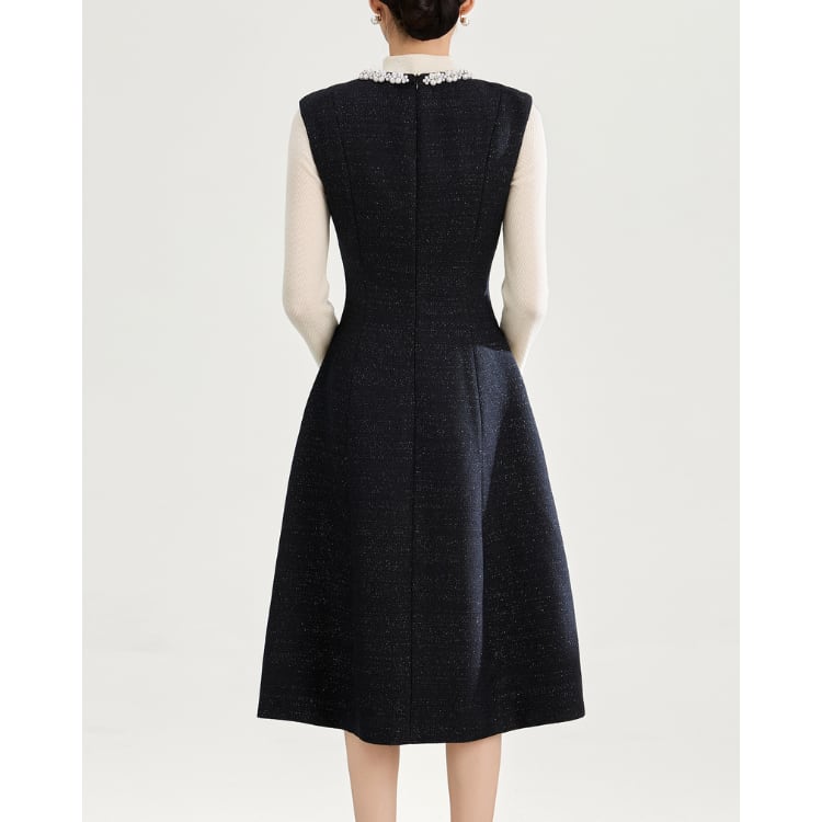 Pearl Neck Tweed A Line Sleeveless Dress Midi Length 30123