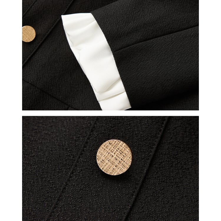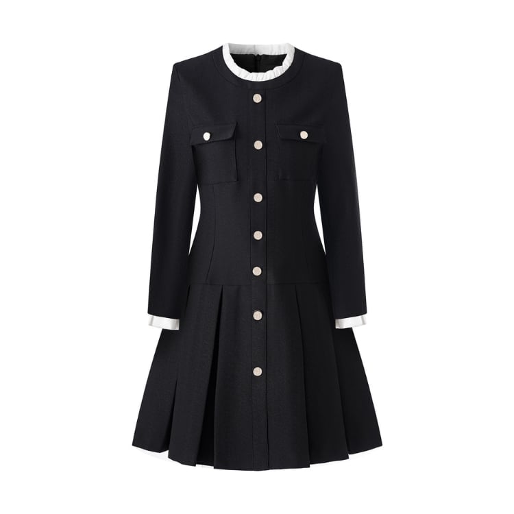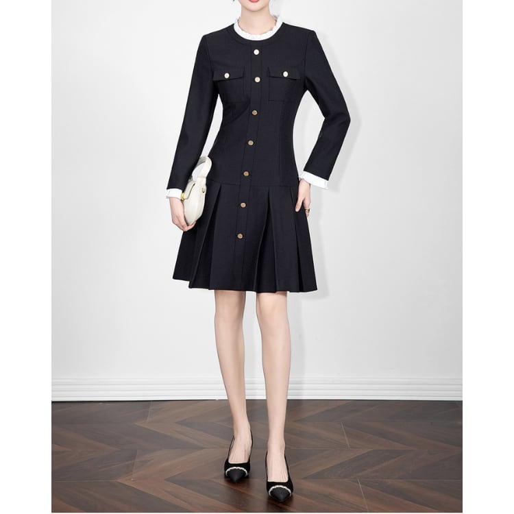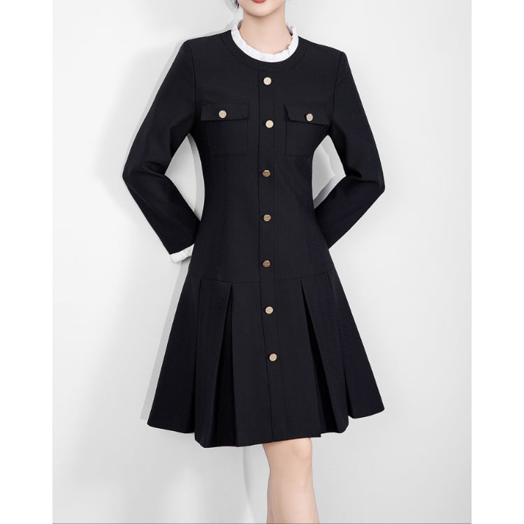 Pleated Hem Long Sleeve A Line Dress Ruffle Collar 30126