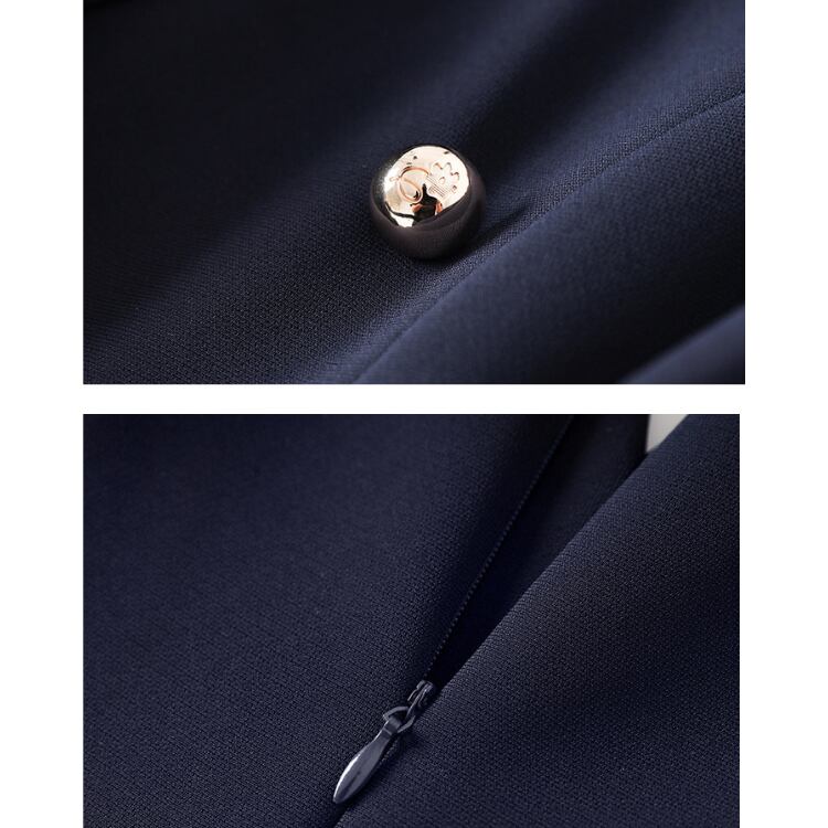 テーラードジャケットのディテールを取り入れたワンピース。フロントはダブルブレスト風のデザインで、金属ボタンを配置することで縦のラインを強調しています。ジャケットのような構造を持ちながら、スカート部分は自然に広がるAラインで構成されています。