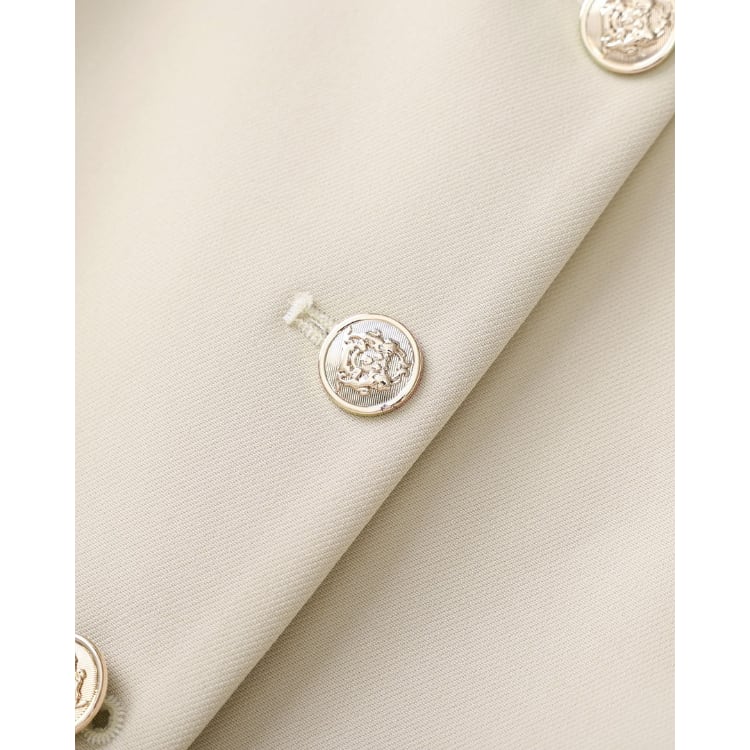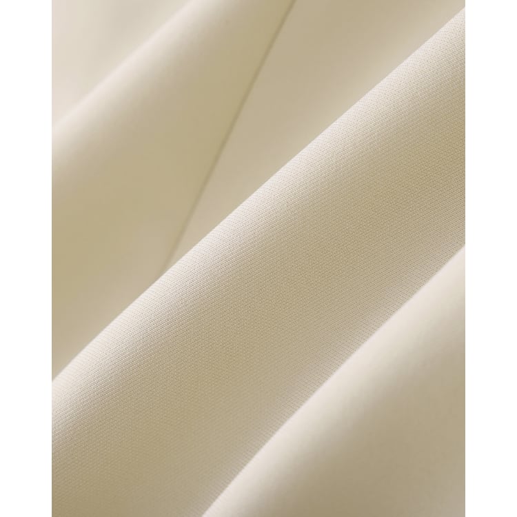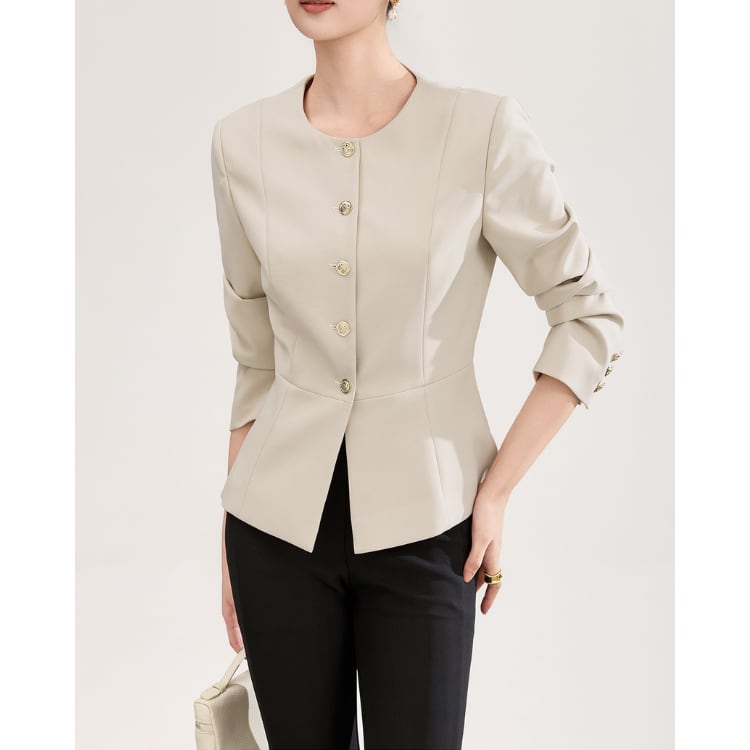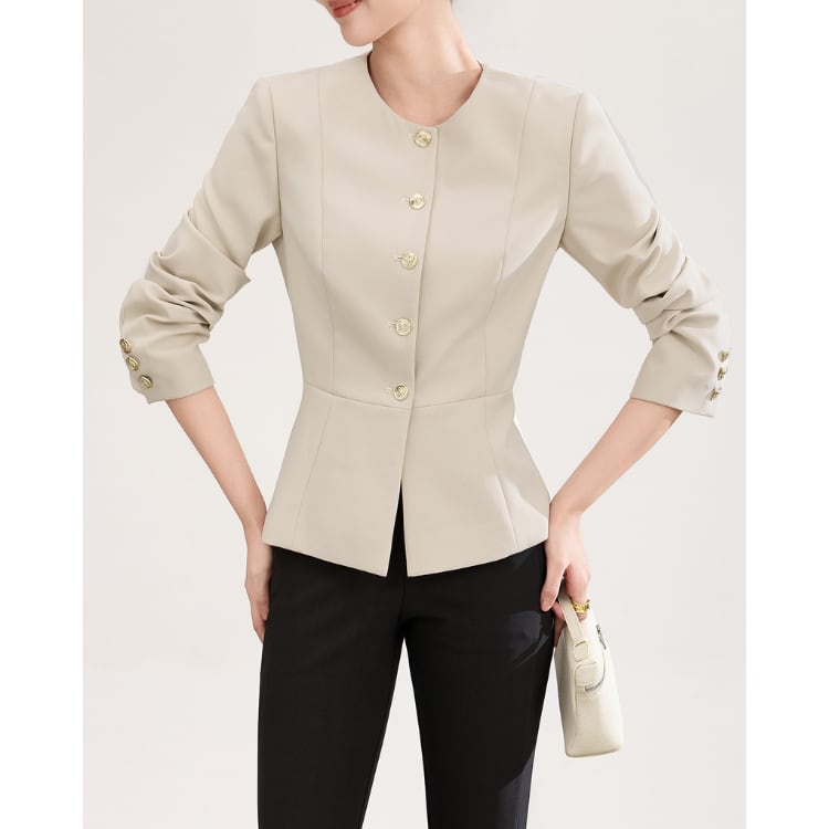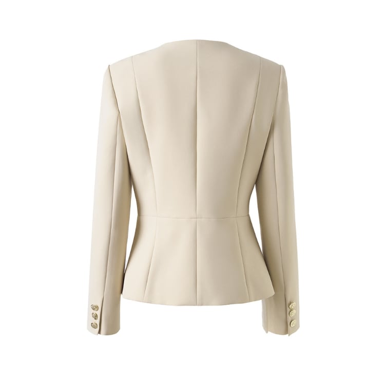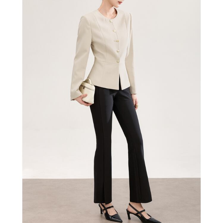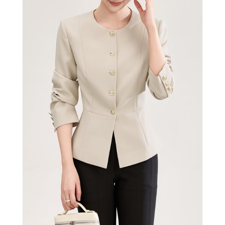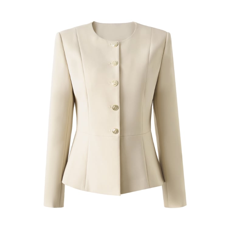 立体裁断でウエストラインを整えた、ノーカラータイプのテーラードジャケット。肩のラインをやや強調した構造により上半身のシルエットが明確になり、ウエストから裾にかけて広がるペプラム切替が自然なメリハリを作ります。
