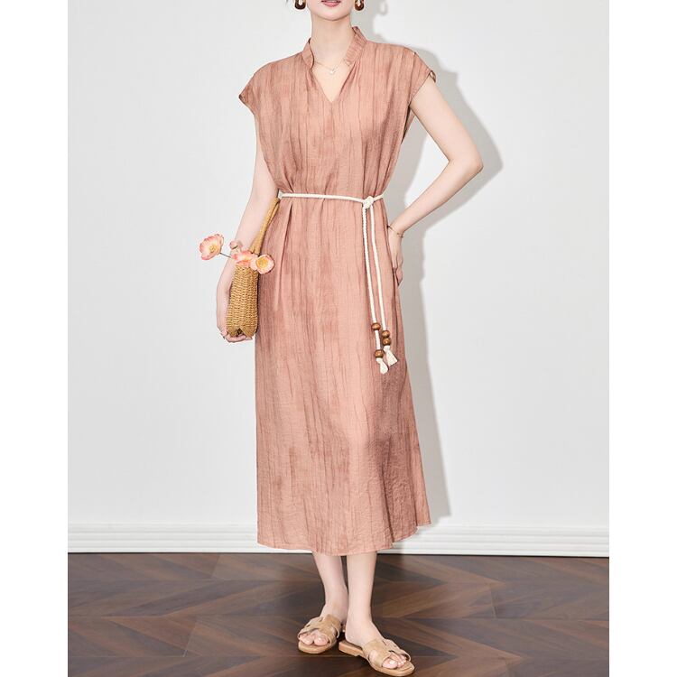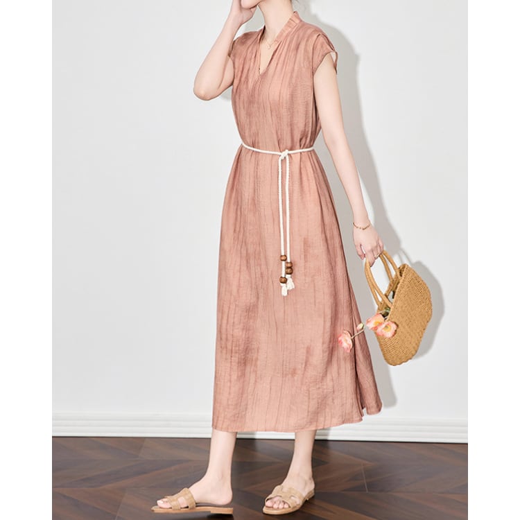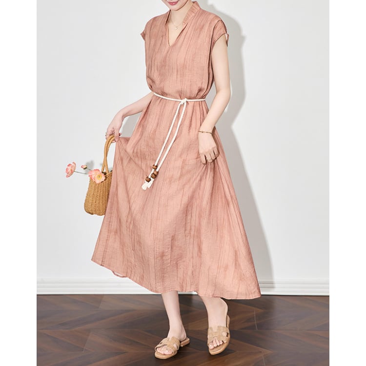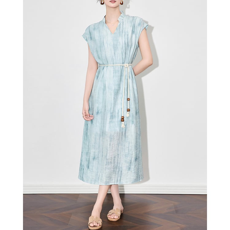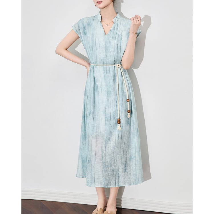 Ink Wash Texture Linen Blend V Neck A Line Dress Belted 2Colors 2603001
