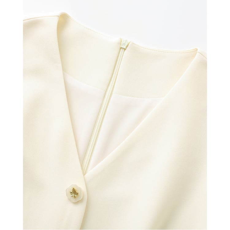 フロントボタンとウエストベルトを軸に、縦ラインを強調したノースリーブワンピース。無駄な装飾を省いた構成により、シルエットと素材の質感が際立つ設計です。
