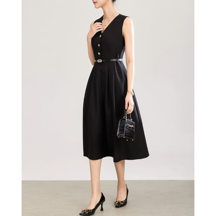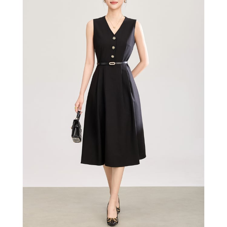 V Neck Sleeveless A Line Midi Dress Belted Button Front 2Colors 2603005