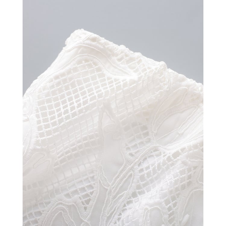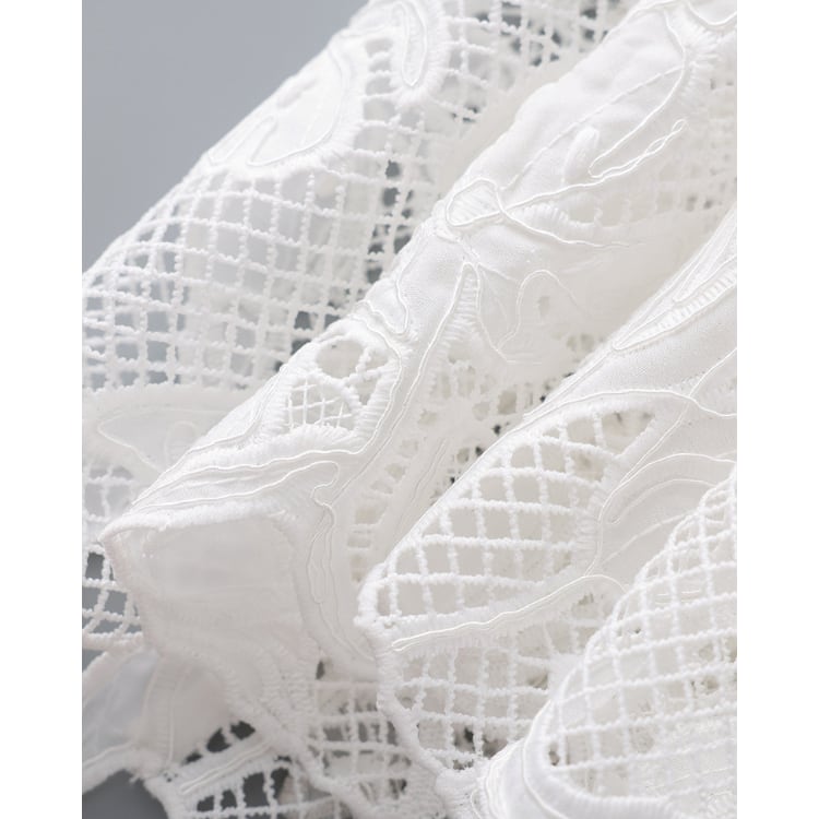 フラワーモチーフを全面に配した水溶レース素材を使用したAラインスカート。柄の密度と透け感のバランスにより、軽さと奥行きのある表情を演出します。
