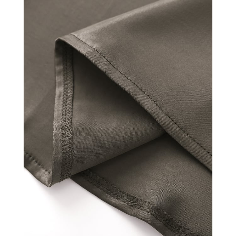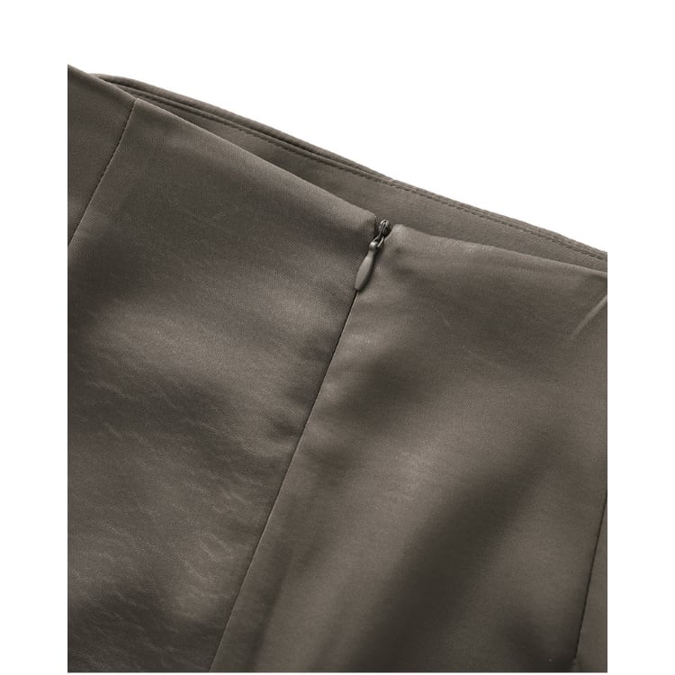 表面に微光沢を持つサテン調素材を使用したラップデザインのミディスカート。落ち感のある生地により、動きに合わせて自然なドレープが生まれ、シルエットに流れを与えます。