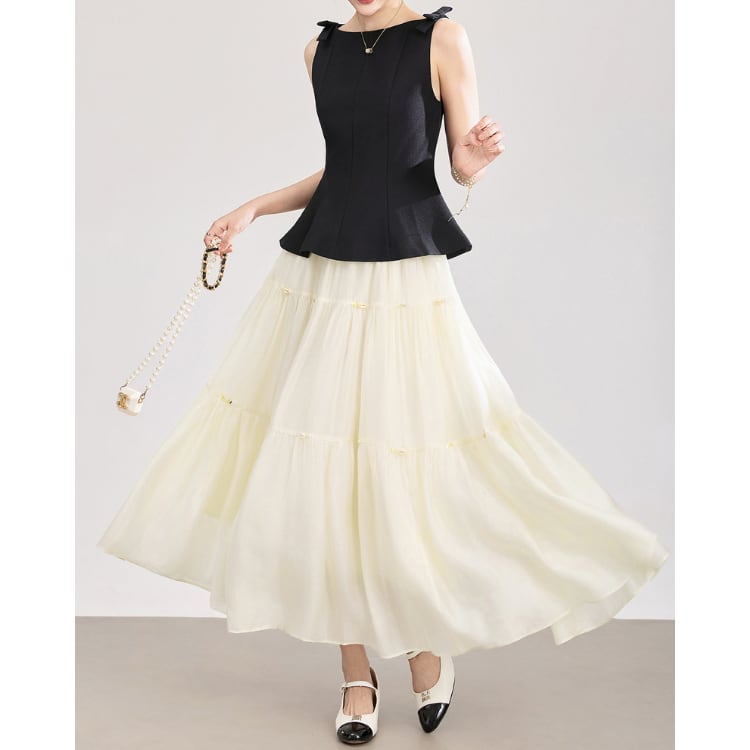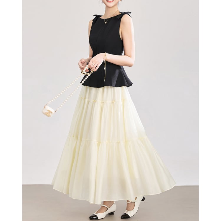 Bow Strap Peplum Top Tiered Skirt Set 2Colors 2603010