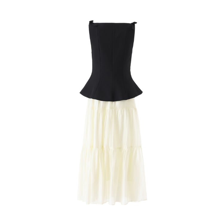 構築的なシルエットのトップスと、軽やかなティアードスカートを組み合わせたセットアップ。異素材のコントラストにより、視覚的な立体感とスタイリングの奥行きを演出します。