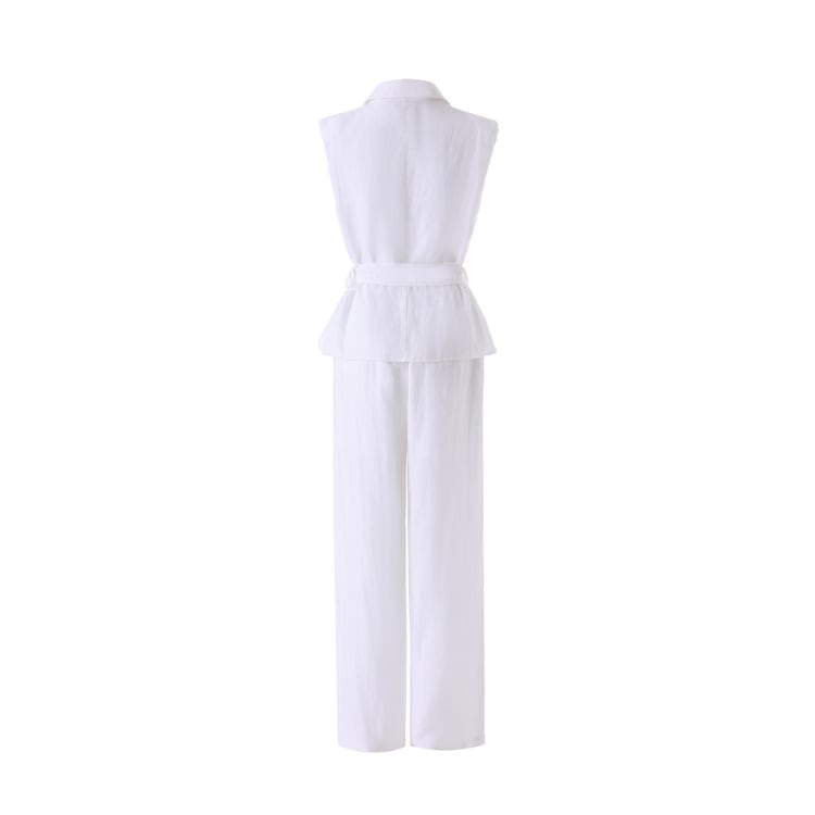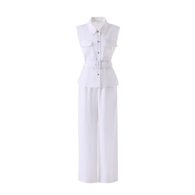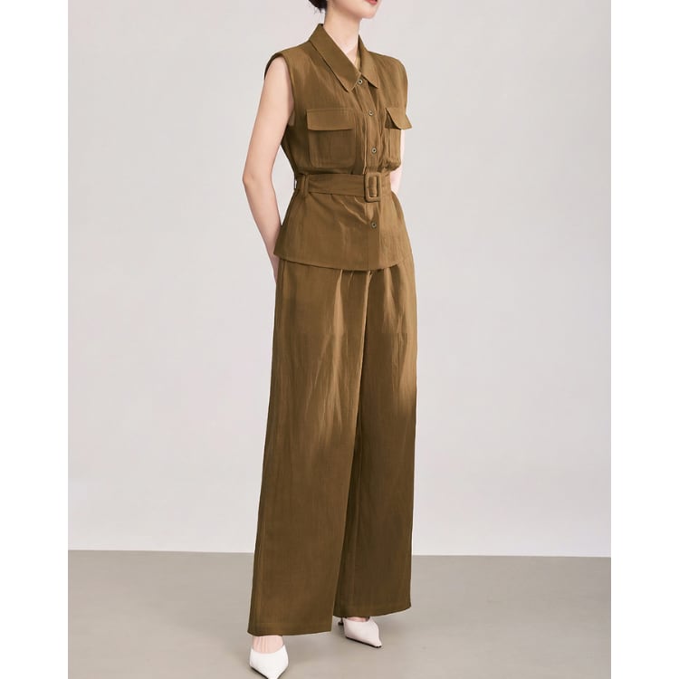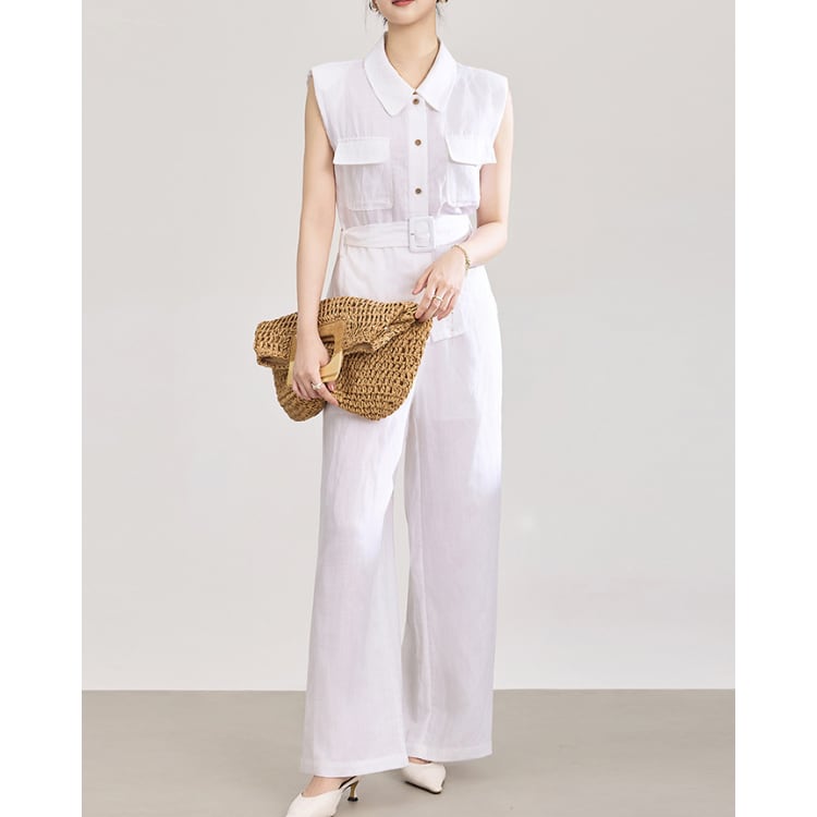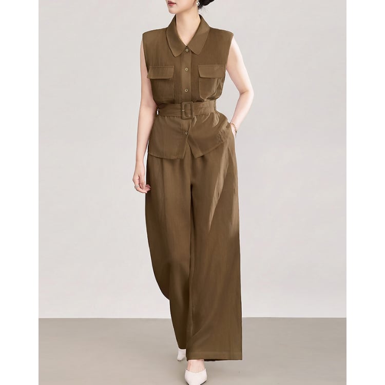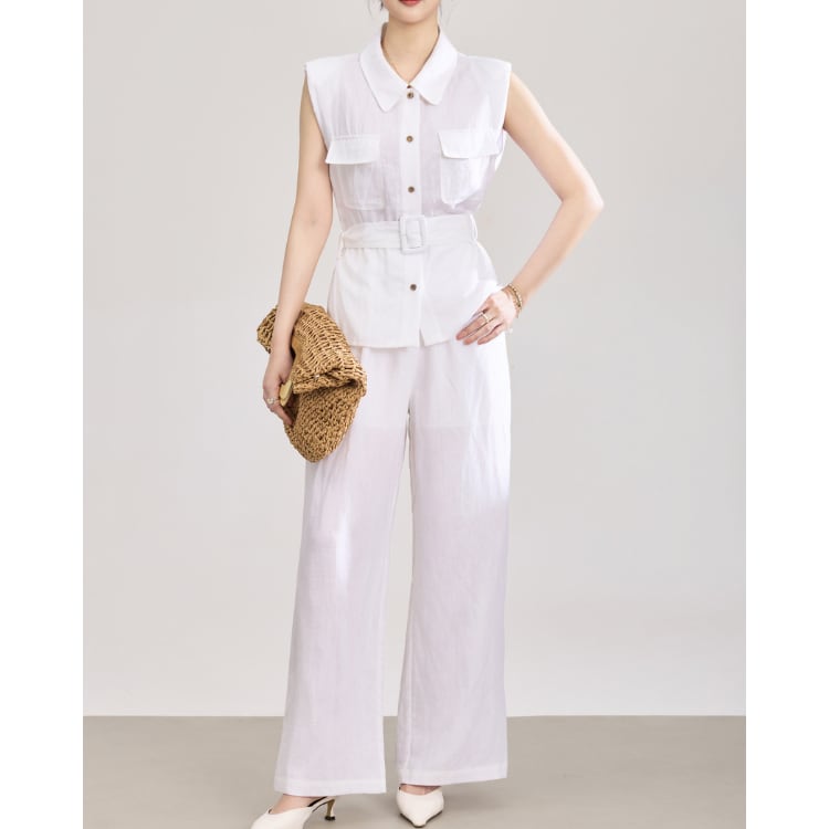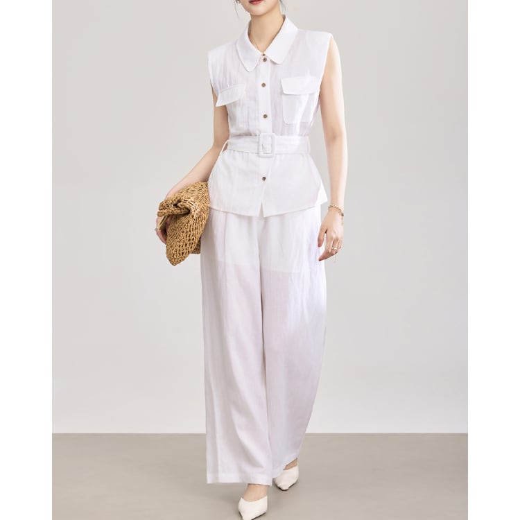 Linen Blend Sleeveless Shirt Wide Leg Pants Set 2Colors 2603011