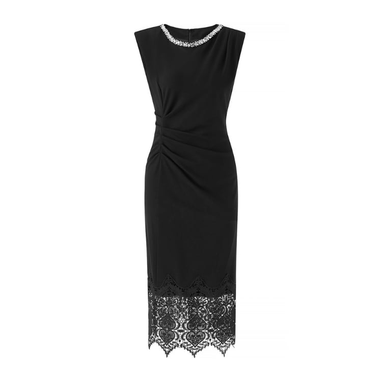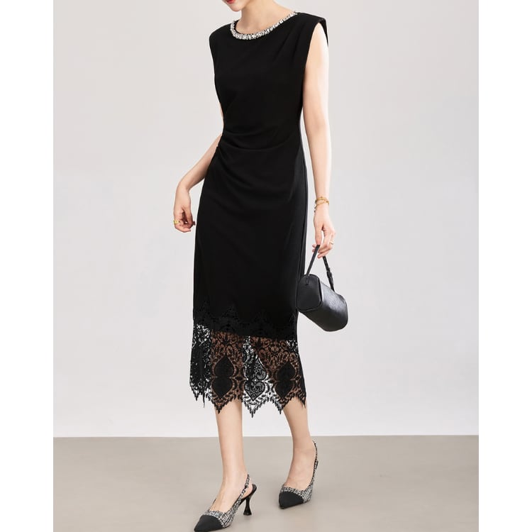 Crystal Neck Knit Lace Hem Midi Dress Black 2603012