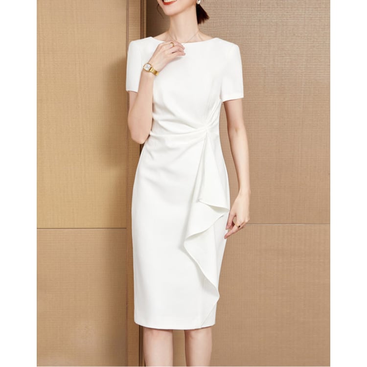 Asymmetric Draped Waist Pencil Midi Dress Short Sleeve 2Colors 2603021