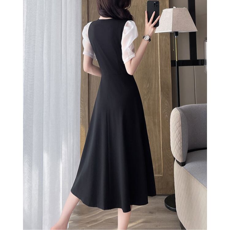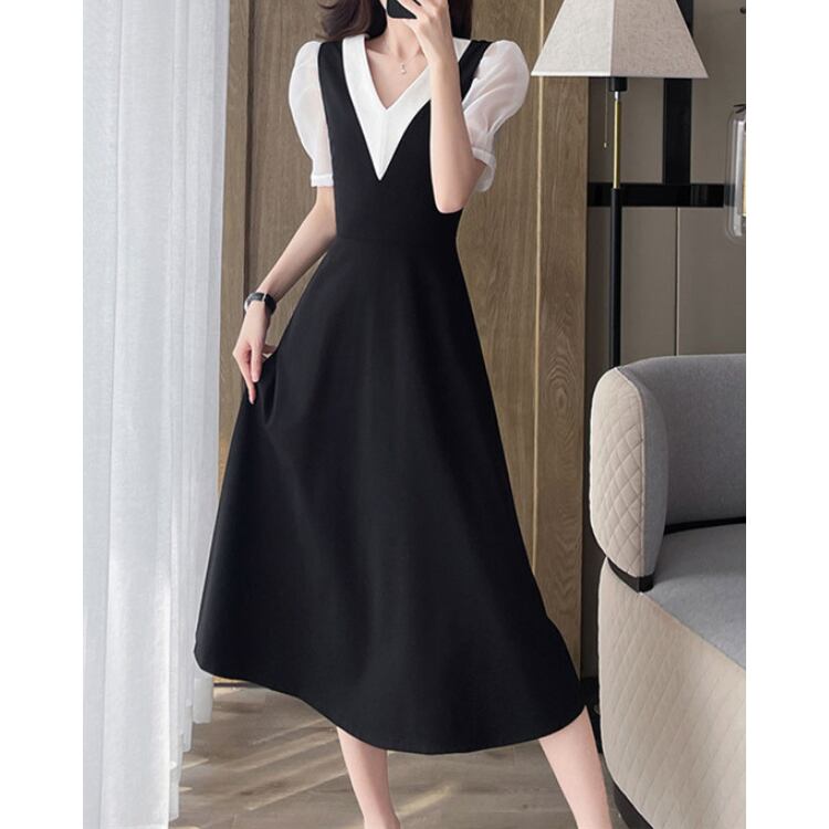 Layered V Neck A Line Midi Dress Contrast Panel 2603022