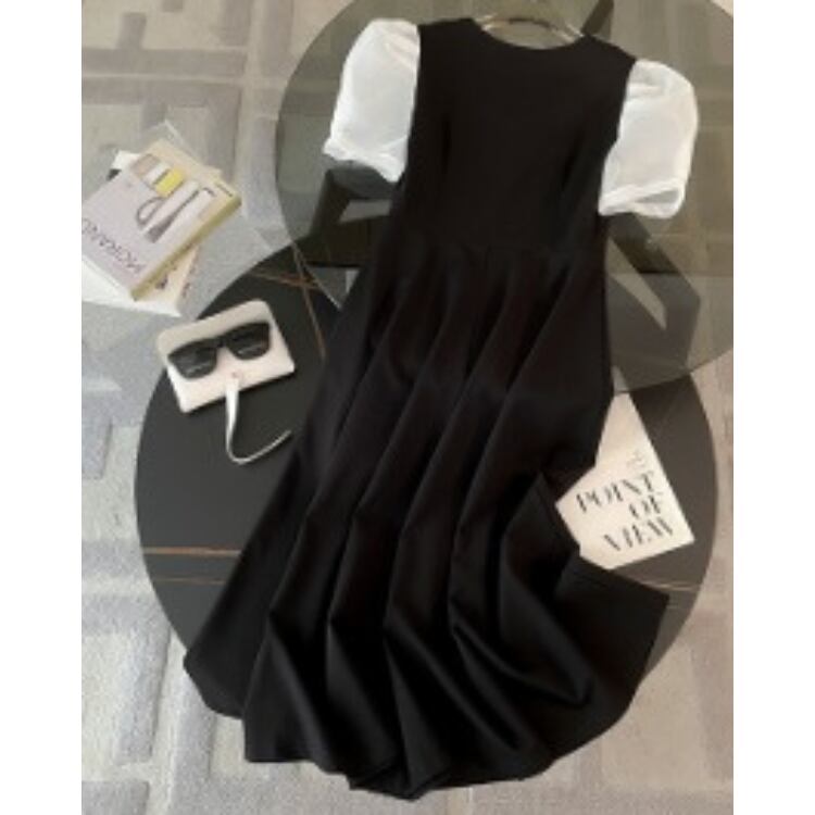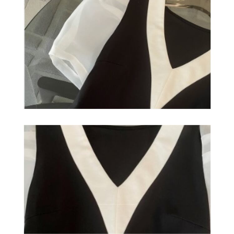インナー風トップスとジャンパースカートを組み合わせたようなレイヤードデザイン。V字に切り替えられたコントラスト配色により、視線を縦方向へ誘導し、上半身をシャープに見せる構成です。