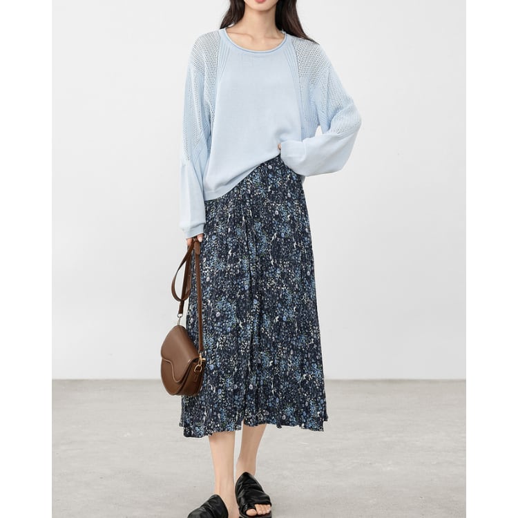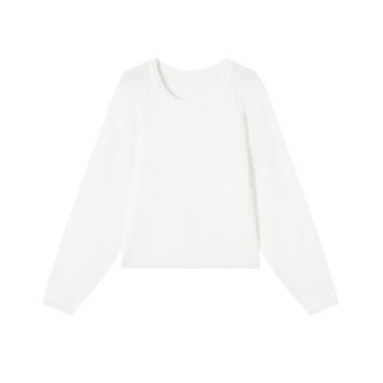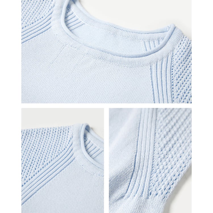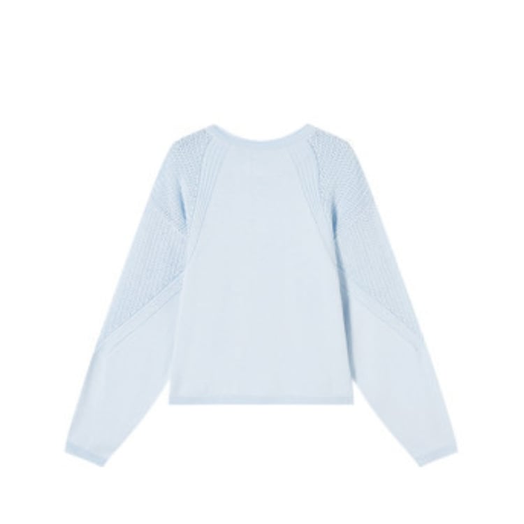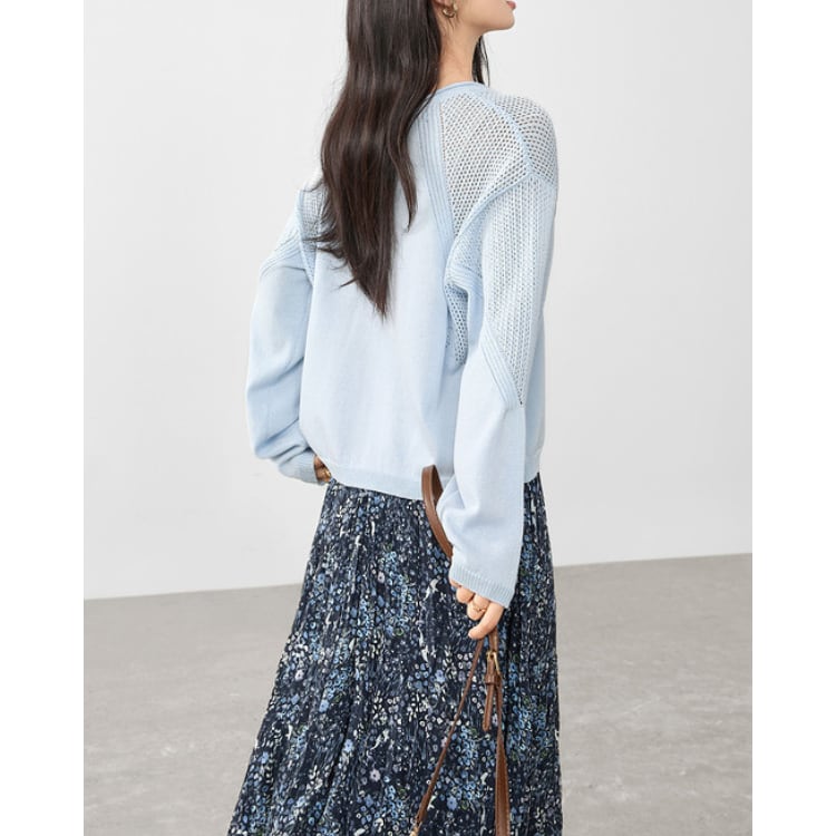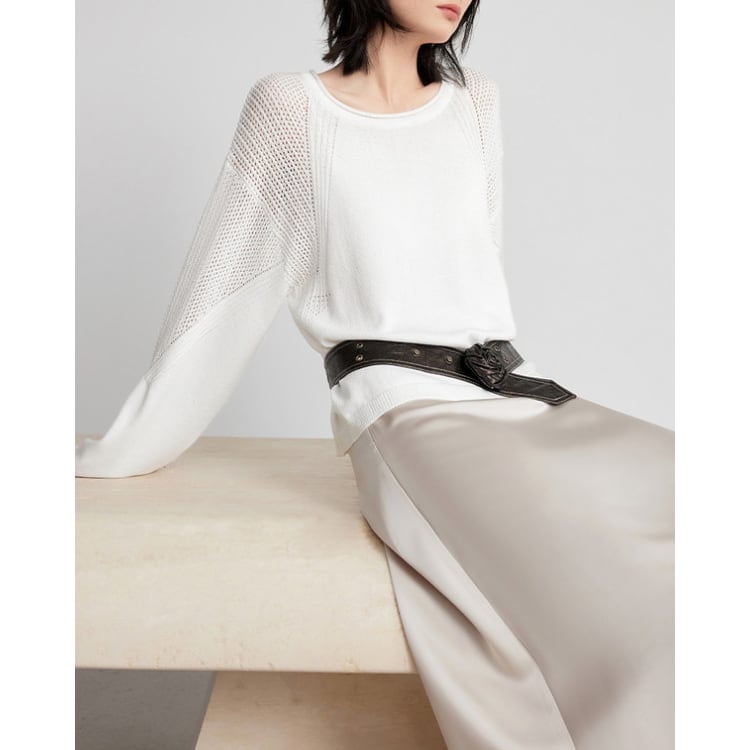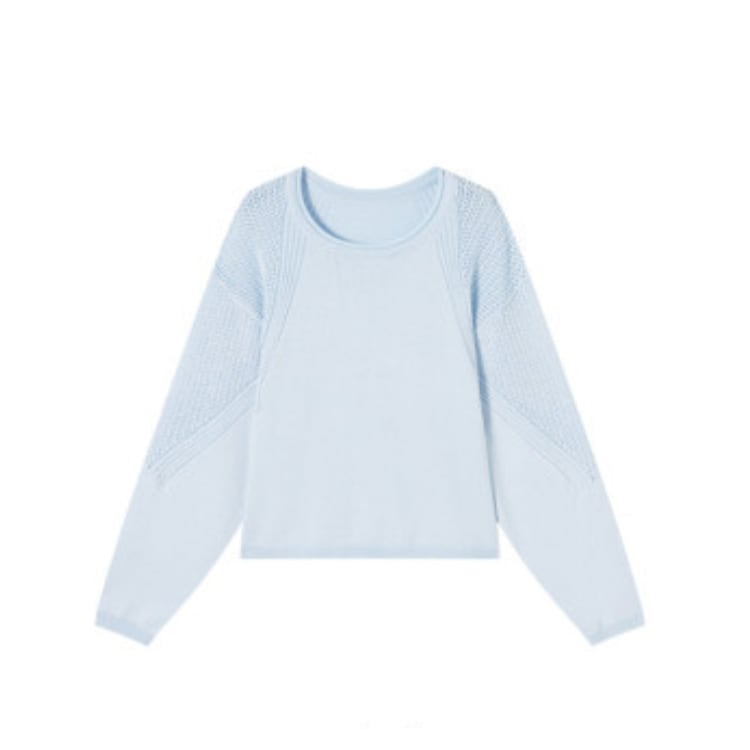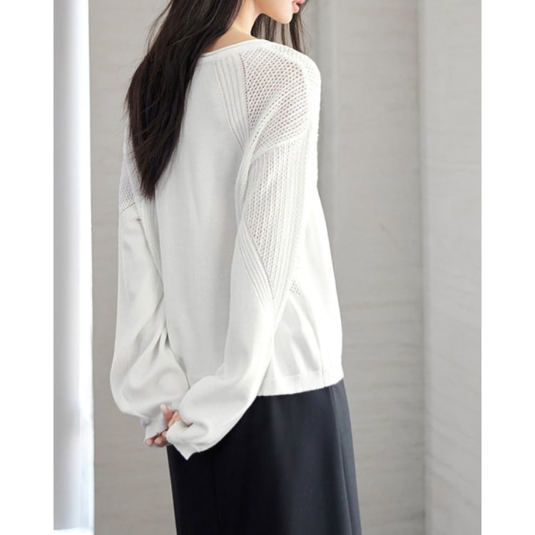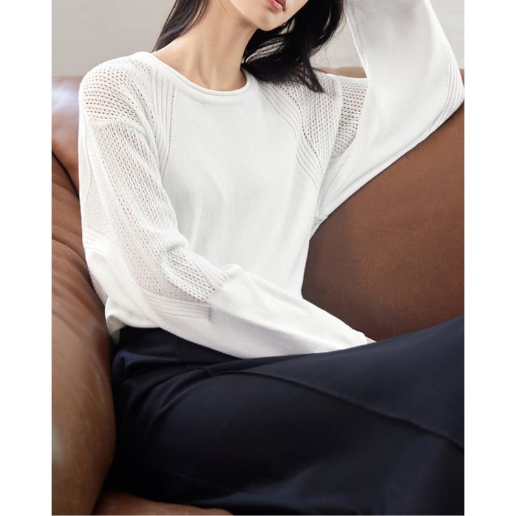 細番手の糸を用いた軽量ニットトップス。身頃はフラットな編地で整えつつ、肩から袖にかけて透かし編みを切り替えることで、通気性と視覚的な抜け感を両立しています。編地のコントラストにより、シンプルな構成の中に立体的な表情を付加。