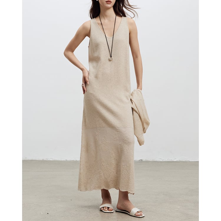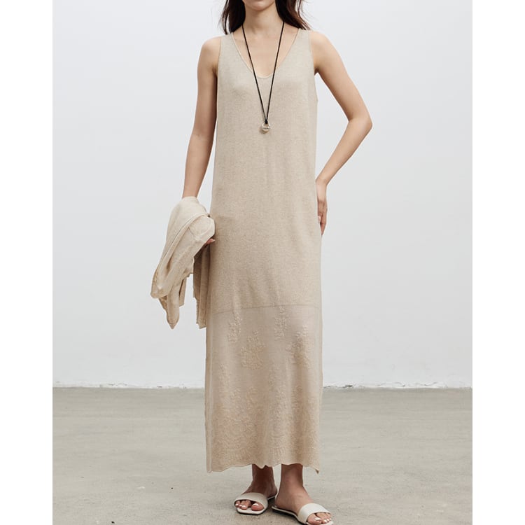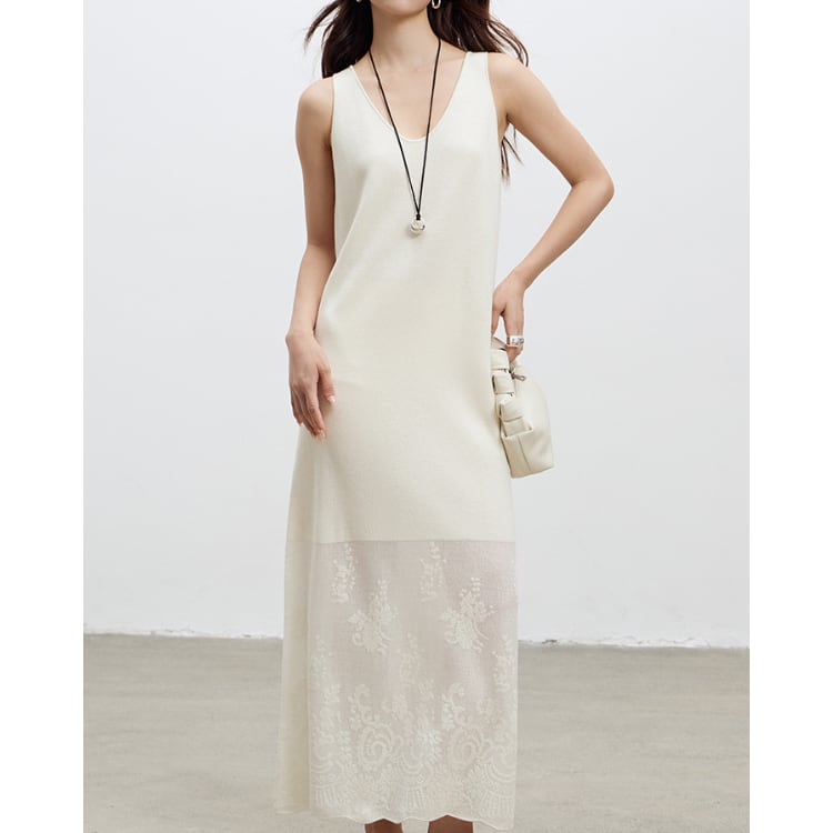 Sleeveless V Neck Knit Maxi Dress Lace Hem 2Colors 2603025