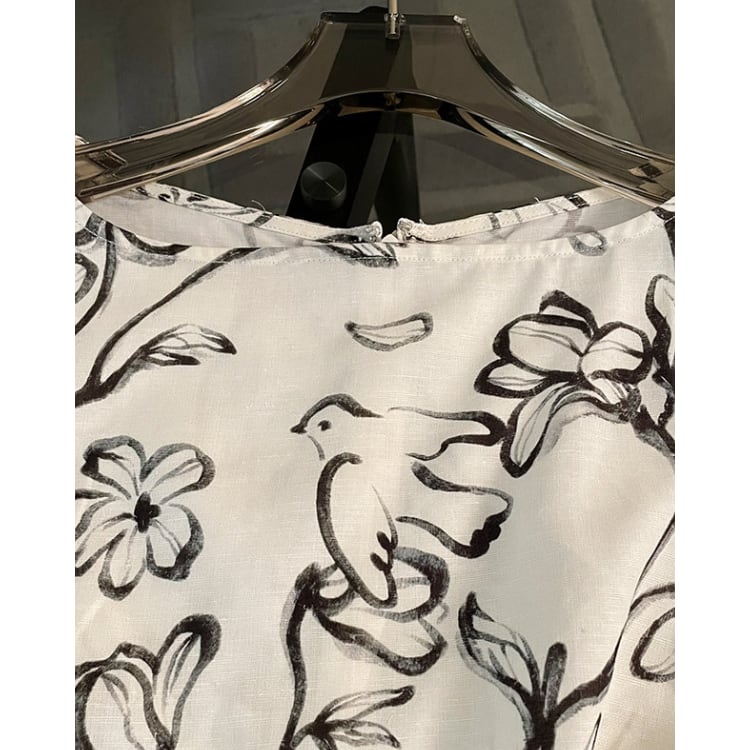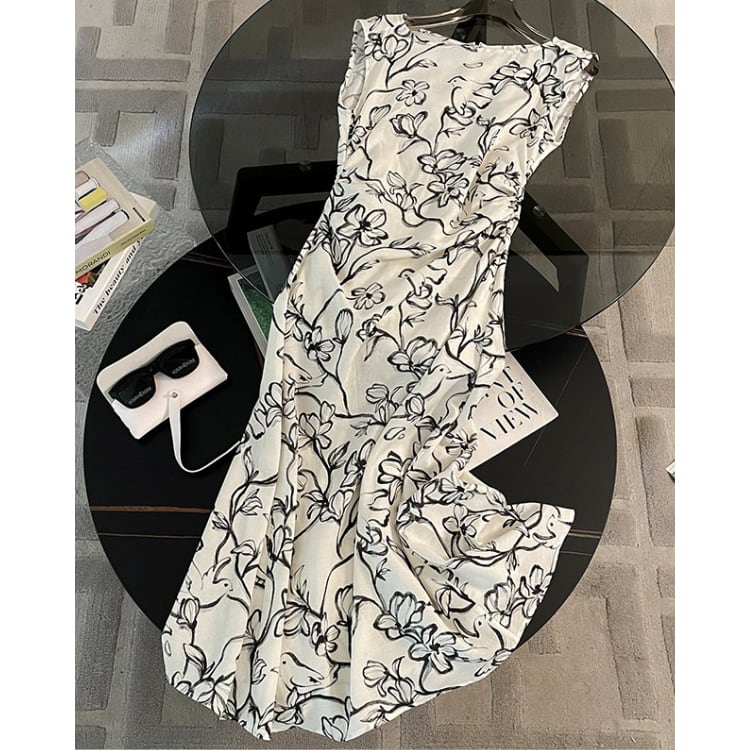 線描きのフラワープリントが全体に広がり、視覚的な軽さと奥行きを演出するスリーブレスワンピース。ベースカラーとのコントラストを抑えた配色により、柄物でありながらも落ち着いた印象に仕上げられています。
