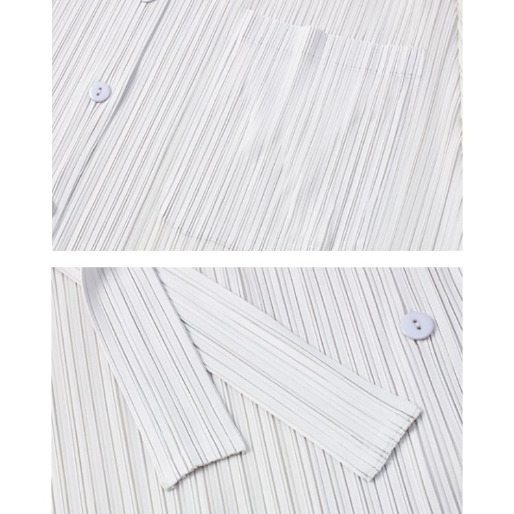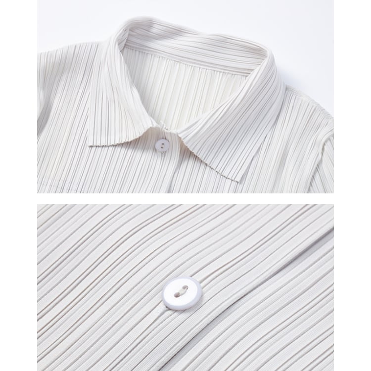 縦方向に入った細かなプリーツ加工が全体にリズムを与え、視覚的な縦長効果を生み出すシャツワンピース。表面に凹凸のあるテクスチャーが単調さを抑え、シンプルな構成の中に表情を加えています。