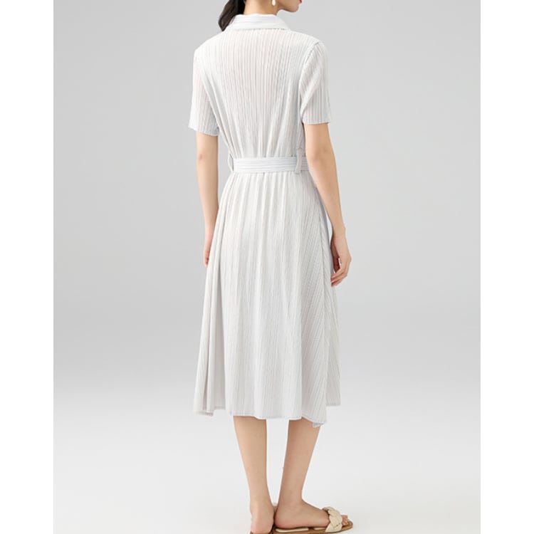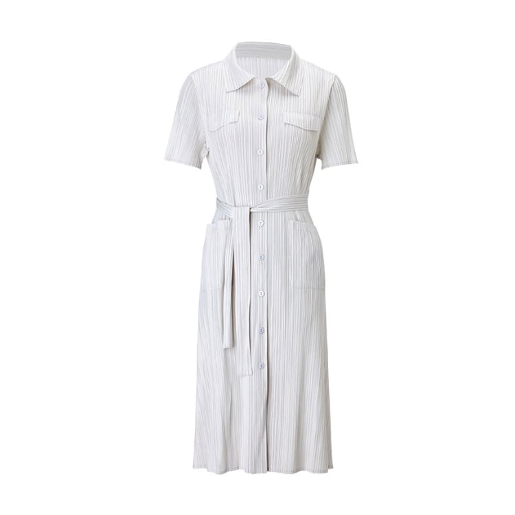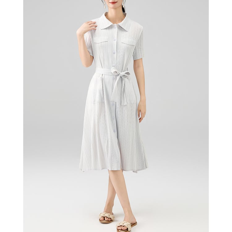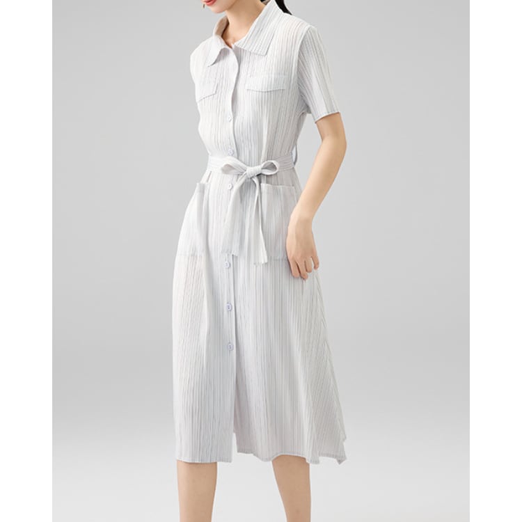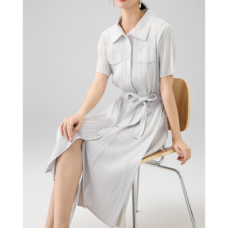 Pleated Shirt Collar Belted Midi Dress 4Colors 2603033