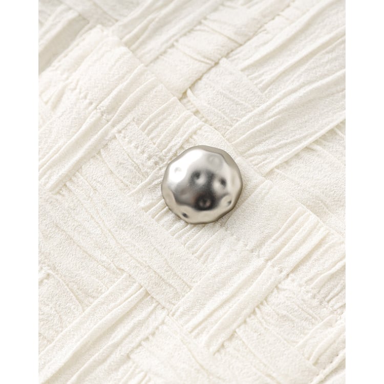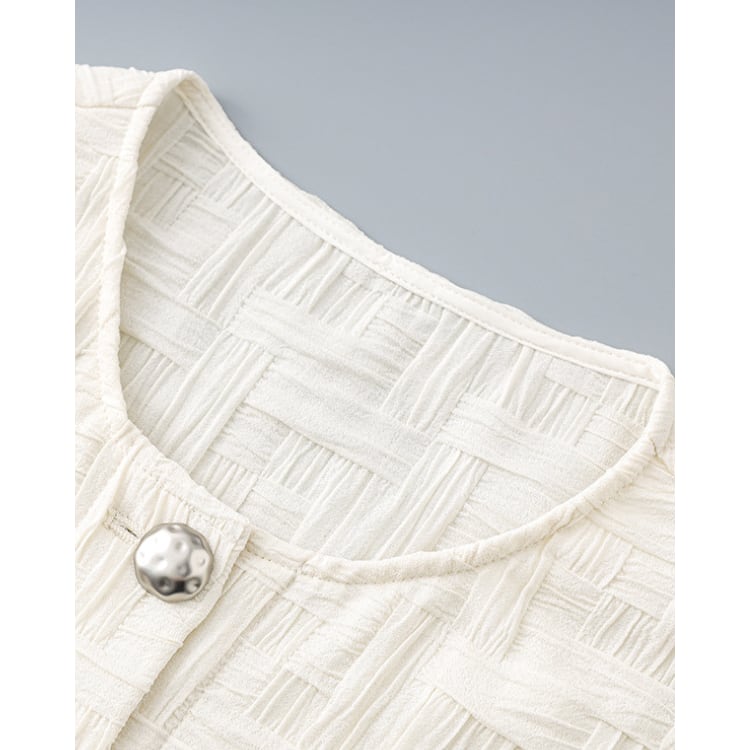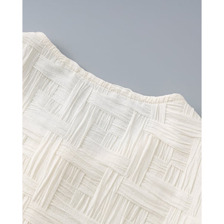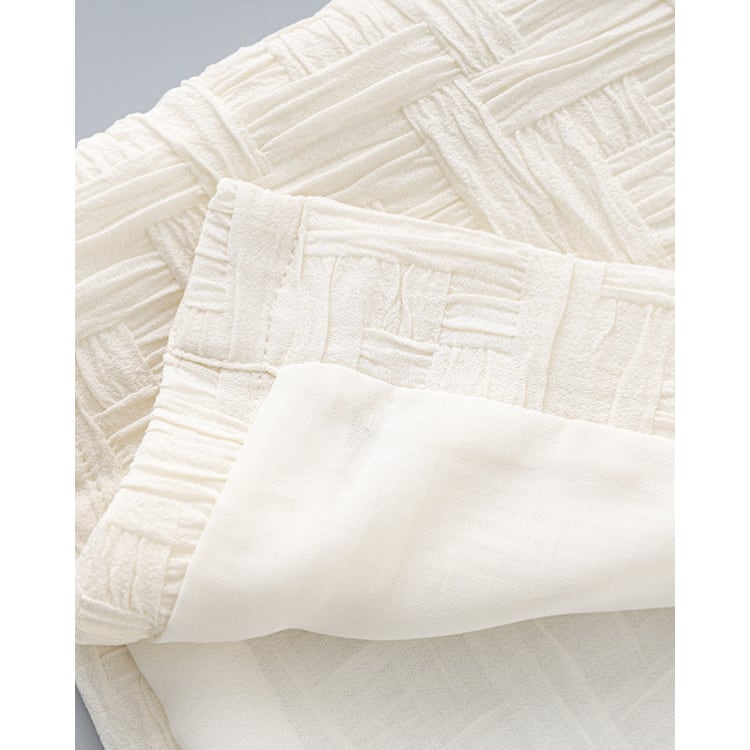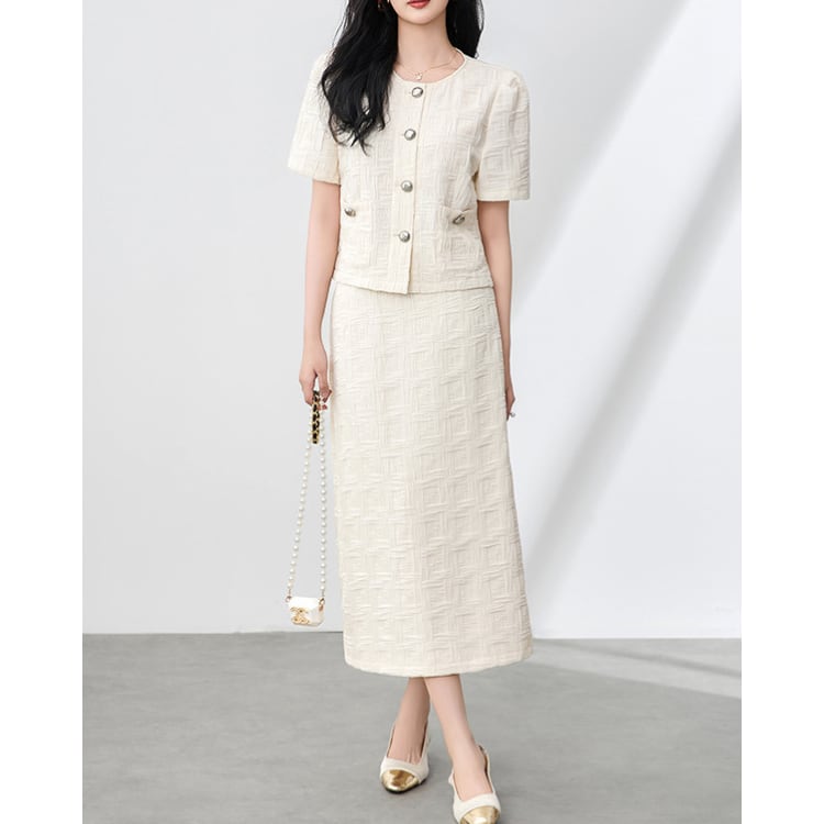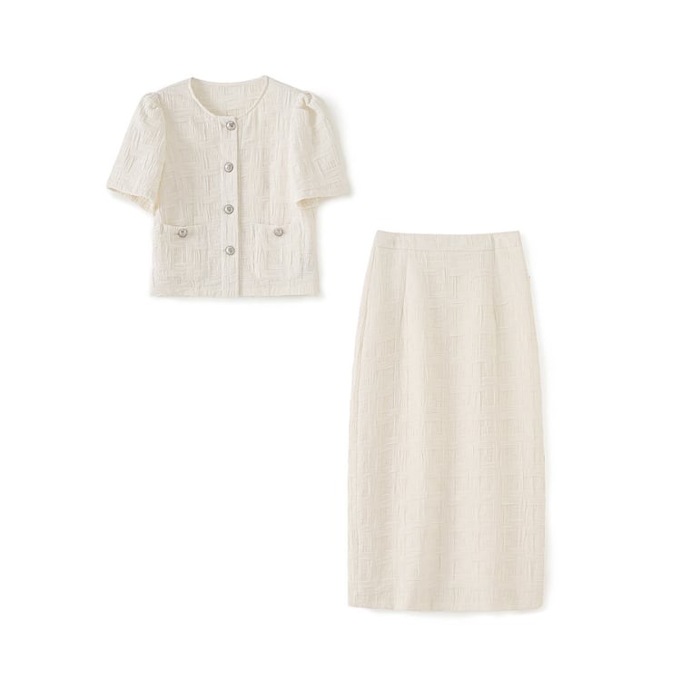 立体感のある織り柄が特徴のトップスとスカートのセットアップ。無地ながらも表面のテクスチャーによって奥行きが生まれ、シンプルな構成の中に変化を持たせています。