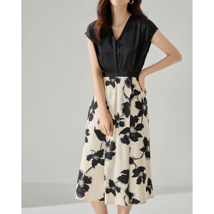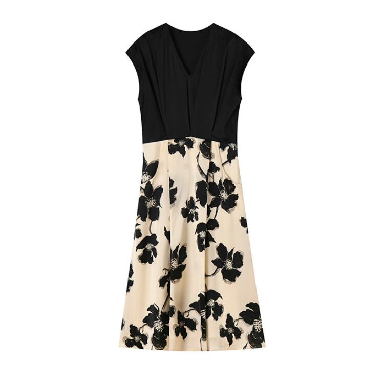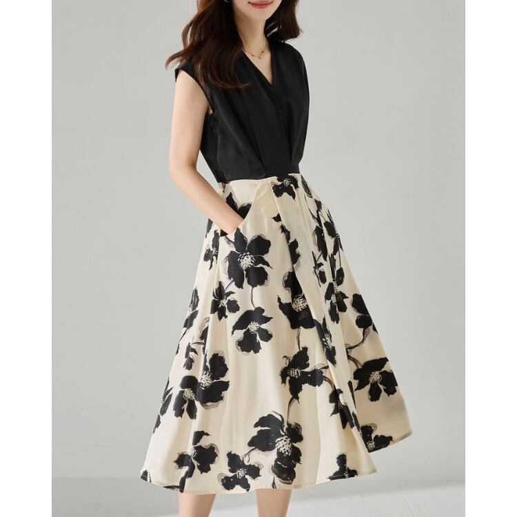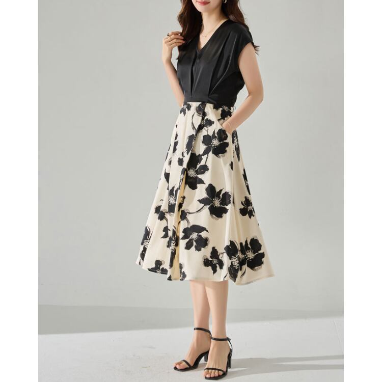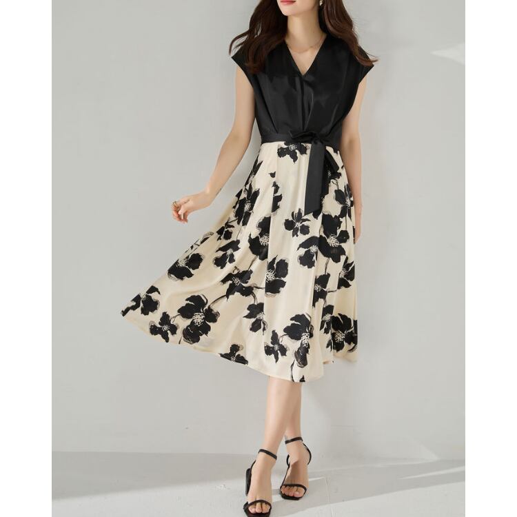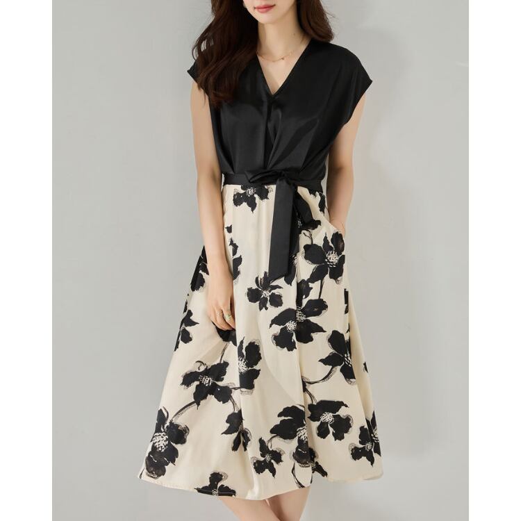 無地トップスとフラワープリントスカートを組み合わせたコンビデザインが特徴のワンピース。上下で素材や視覚要素を切り替えることで、1枚でスタイリングに奥行きを持たせています。