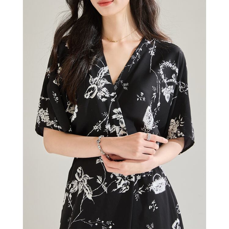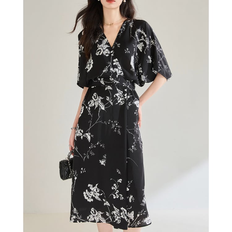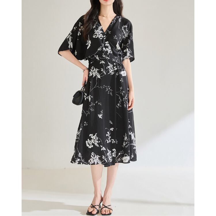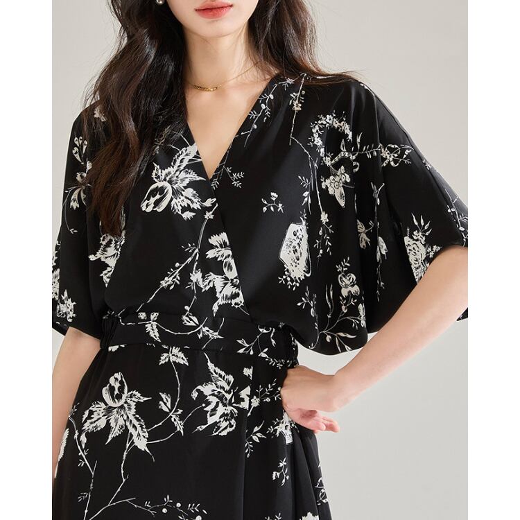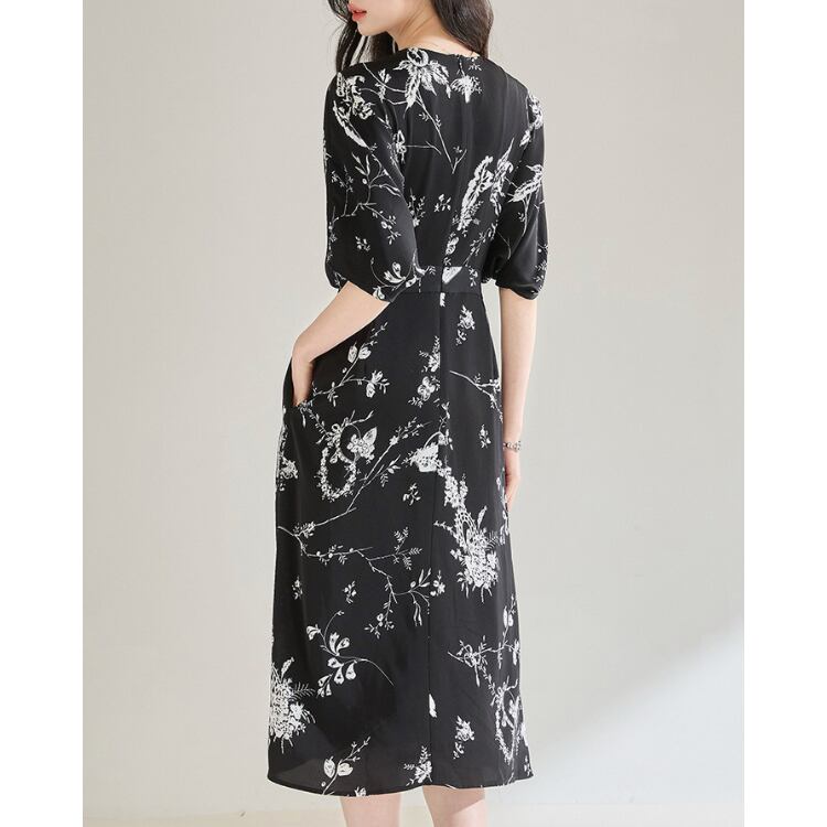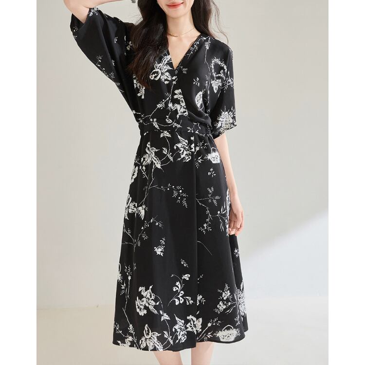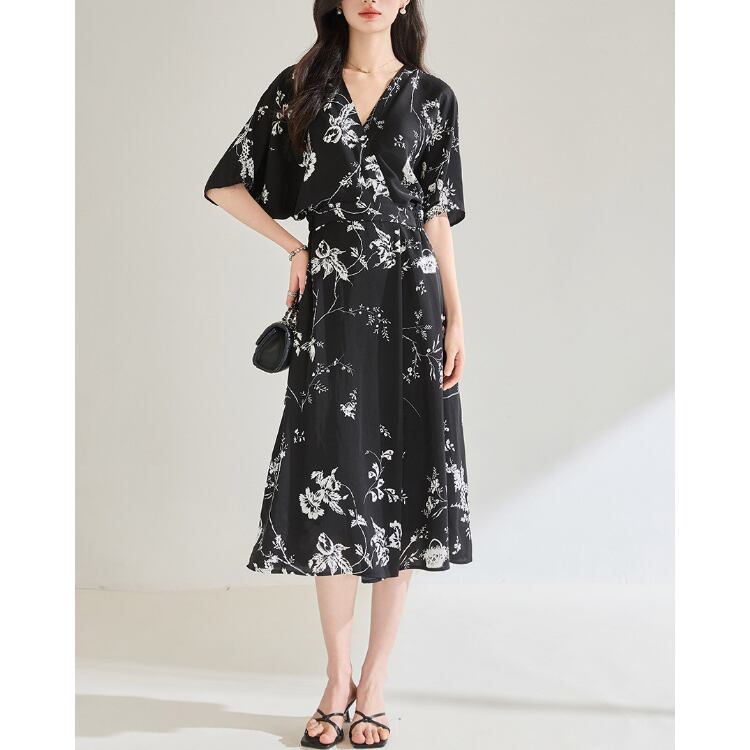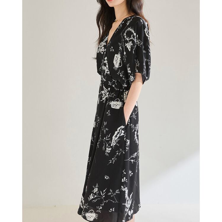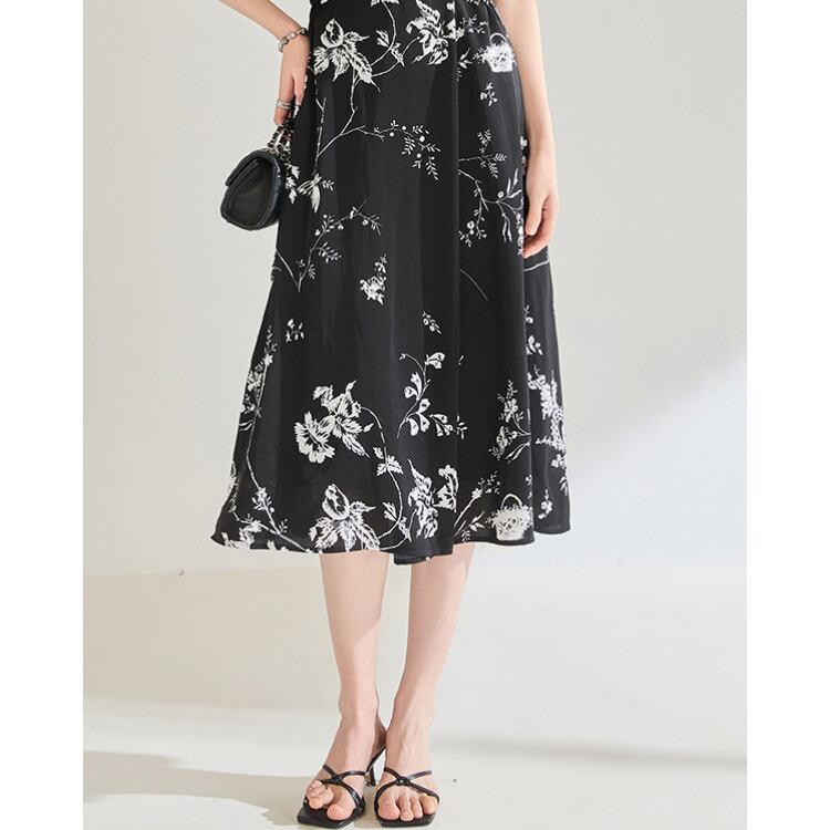 モノトーンのフラワープリントが全体に広がり、柄のコントラストによって奥行きのある印象を演出するワンピース。落ち着いた配色により、柄物でありながらスタイリングに取り入れやすいバランスに仕上げられています。